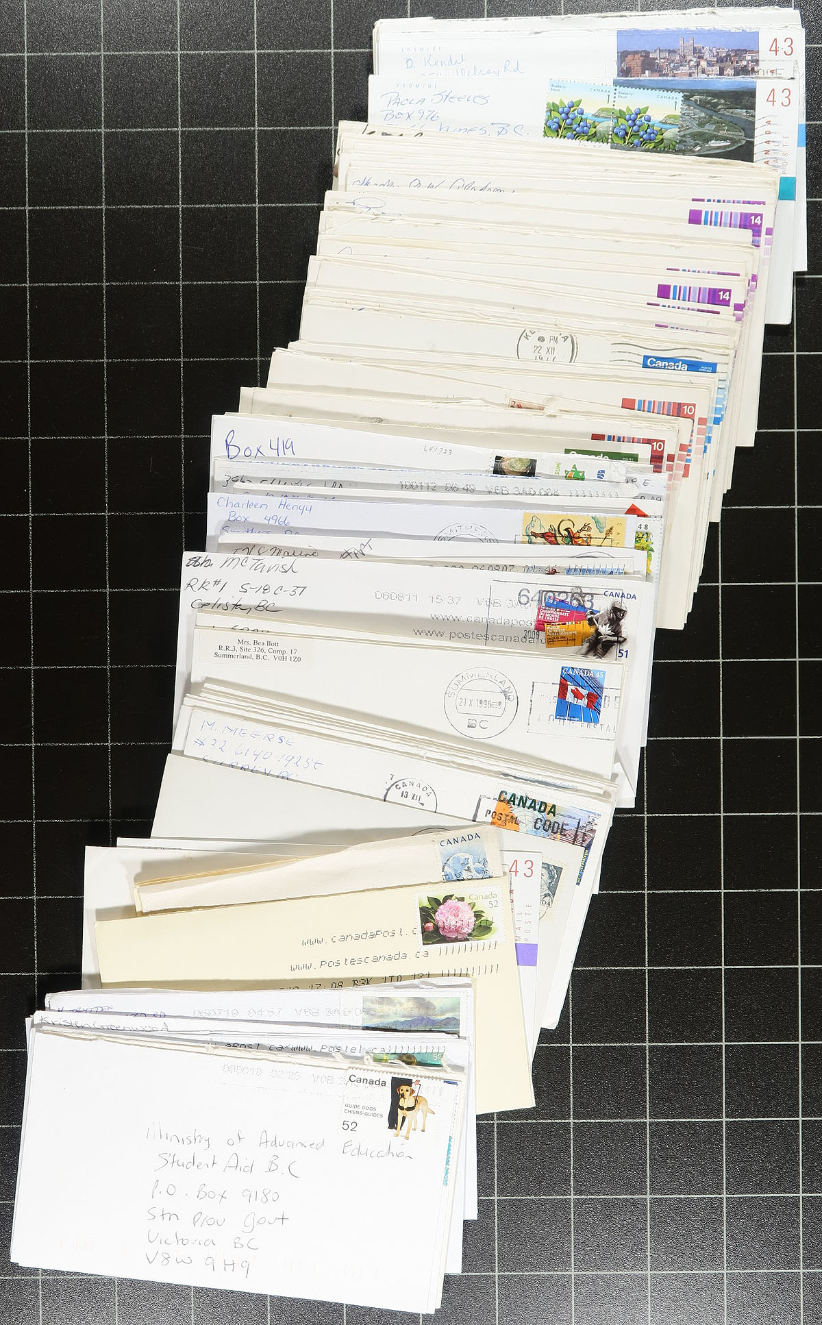 British Columbia Postmarks. Accumulation of roughly 600 covers collected for British Columbia postmarks, loose in a box, generally ranging from the 1960's to the early 2000's, with a few items possible on either side of the given range. The lot contains several hundred different towns (including many small towns), ranging from A to Y including Crescent Beach, Okanagan Falls, Adams Lake, Baldy Hughes, Halfmoon Bay, Gold River, Gillies Bay, Garibaldi Highlands, Canal Flats, Alert Bay, and much more. Postmarks include cds, POCON, Klussendorf, slogan, spray on, and a few other types, with some towns having different postmarks or frankings. All the covers appear to be commercial in nature, including several #10 sized envelopes, with some having corner advertising. A nice lot for the postmark hunter, a few faults to be expected, overall fine to very fine. Estimate =