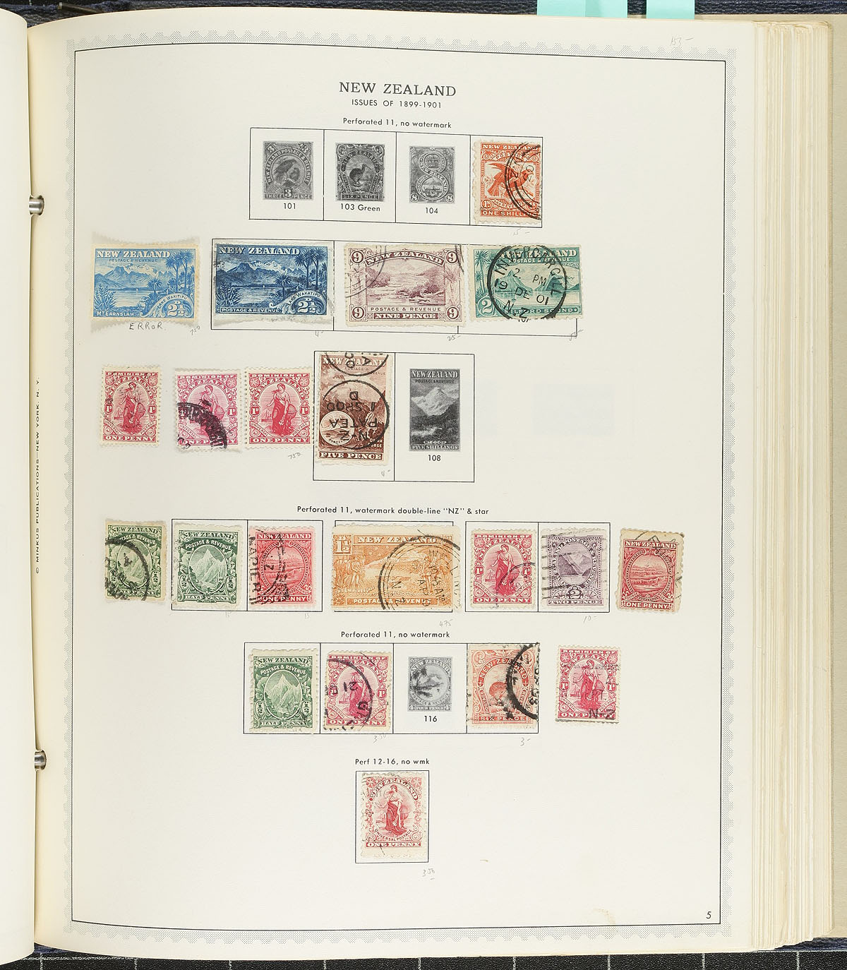 Collection of primarily used British Oceania, 1870's-1960's, containing many hundreds of stamps in a British Oceania Minkus album. The collection essentially contains a decent run of Australia from 1913-1960's, including a selection of used Kangaroos and KGV Heads, along with a few mint singles and sets cataloguing $5 to $15 and up, along with New Zealand used from the 1870s to the 1960s, and smaller selections of Australia States. The collection also includes a few additional pages of Australia used. Owner's older Scott catalogue value totals US$1,090.00, leaving better finds to the dedicated collector. A collection that should be expanded as the album contains spaces for over 15 other countries, overall fine to very fine. Estimate =