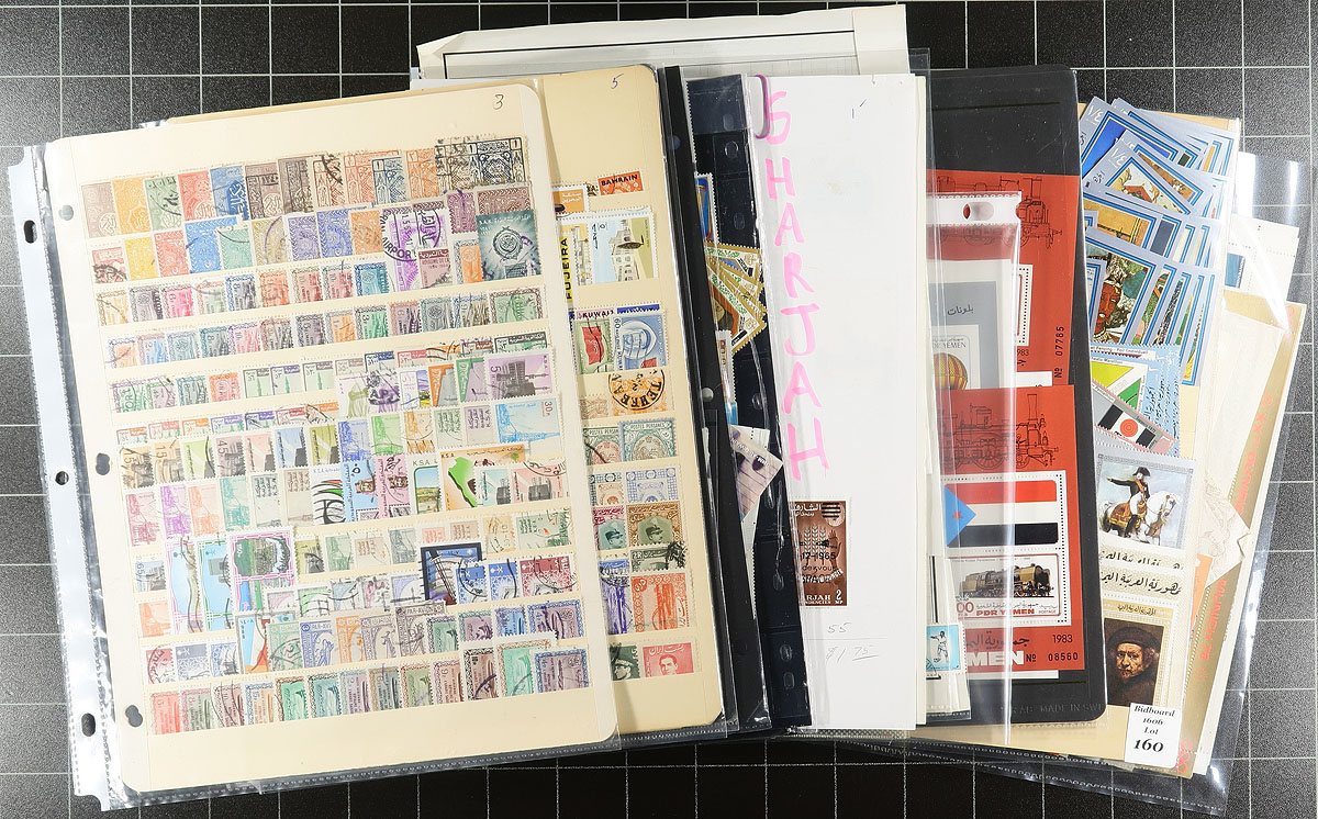 Middle East. An interesting group of mint and used Middle East stamps, 1900's-1970's, containing many hundreds of stamps in roughly 15 stock or album pages. A cursory check indicated better representation from Yemen, Iraq, Saudi Arabia, Sand Dunes, and a few others, noting singles, primarily sets, and a selection of souvenir sheets, with a few cataloguing $5 to $10 and up. Owner's 2015 Scott catalogue value for the group totals US$752.00, leaving better finds to the specialist. A popular collecting area, ideal for all worldwide collectors, overall fine to very fine. Estimate =