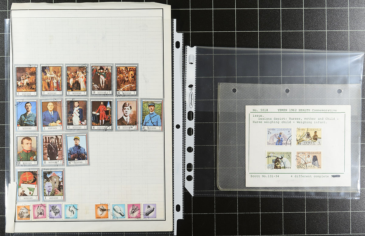 Middle East. An interesting group of mint and used Middle East stamps, 1900's-1970's, containing many hundreds of stamps in roughly 15 stock or album pages. A cursory check indicated better representation from Yemen, Iraq, Saudi Arabia, Sand Dunes, and a few others, noting singles, primarily sets, and a selection of souvenir sheets, with a few cataloguing $5 to $10 and up. Owner's 2015 Scott catalogue value for the group totals US$752.00, leaving better finds to the specialist. A popular collecting area, ideal for all worldwide collectors, overall fine to very fine. Estimate =