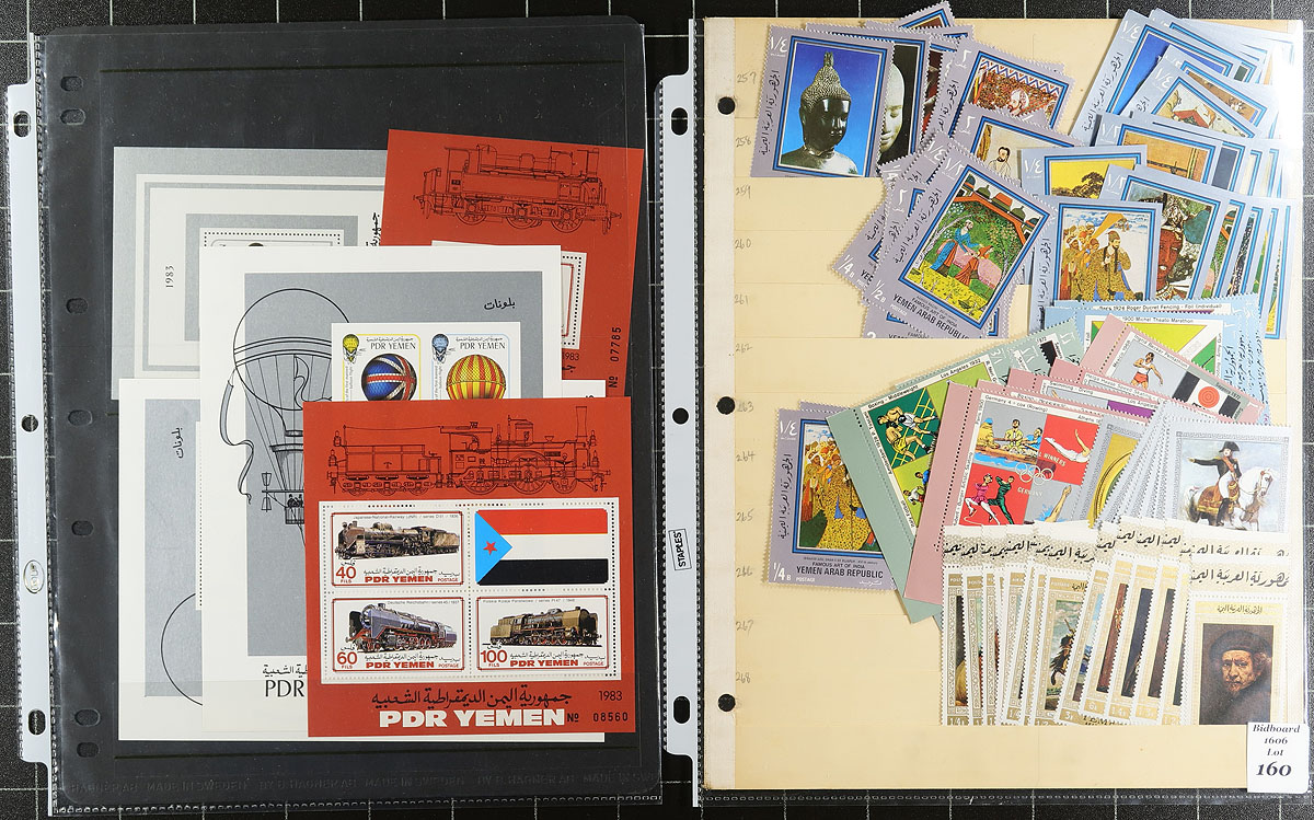 Middle East. An interesting group of mint and used Middle East stamps, 1900's-1970's, containing many hundreds of stamps in roughly 15 stock or album pages. A cursory check indicated better representation from Yemen, Iraq, Saudi Arabia, Sand Dunes, and a few others, noting singles, primarily sets, and a selection of souvenir sheets, with a few cataloguing $5 to $10 and up. Owner's 2015 Scott catalogue value for the group totals US$752.00, leaving better finds to the specialist. A popular collecting area, ideal for all worldwide collectors, overall fine to very fine. Estimate =