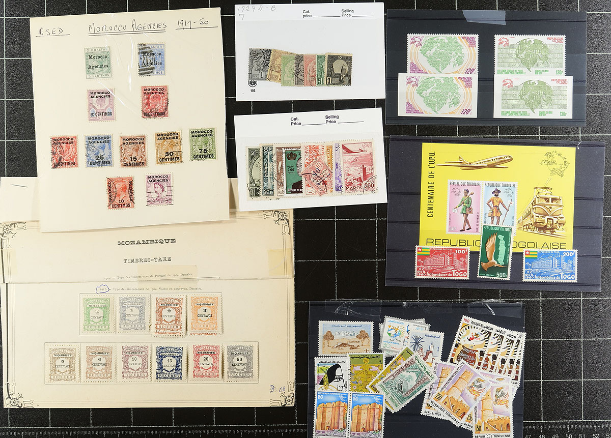 French Africa. Group of mint and used primarily French Colonies in Africa, 1950's-1970's, containing many hundreds of stamps in roughly 12 stock or album pages, and a few dealer cards. A quick check indicated better representation from Togo, Rwanda, Tunisia, and a few more, noting singles, several sets, and souvenir sheets, with some material cataloguing $5 to $10 each, leaving better finds for the dedicated collector. Our online photos show an overview and should be worth a look. Overall fine to very fine. Estimate =