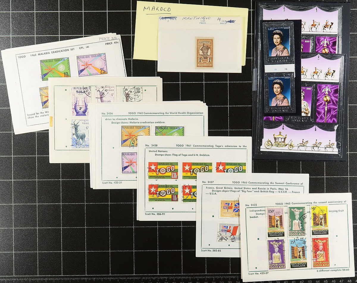 French Africa. Group of mint and used primarily French Colonies in Africa, 1950's-1970's, containing many hundreds of stamps in roughly 12 stock or album pages, and a few dealer cards. A quick check indicated better representation from Togo, Rwanda, Tunisia, and a few more, noting singles, several sets, and souvenir sheets, with some material cataloguing $5 to $10 each, leaving better finds for the dedicated collector. Our online photos show an overview and should be worth a look. Overall fine to very fine. Estimate =