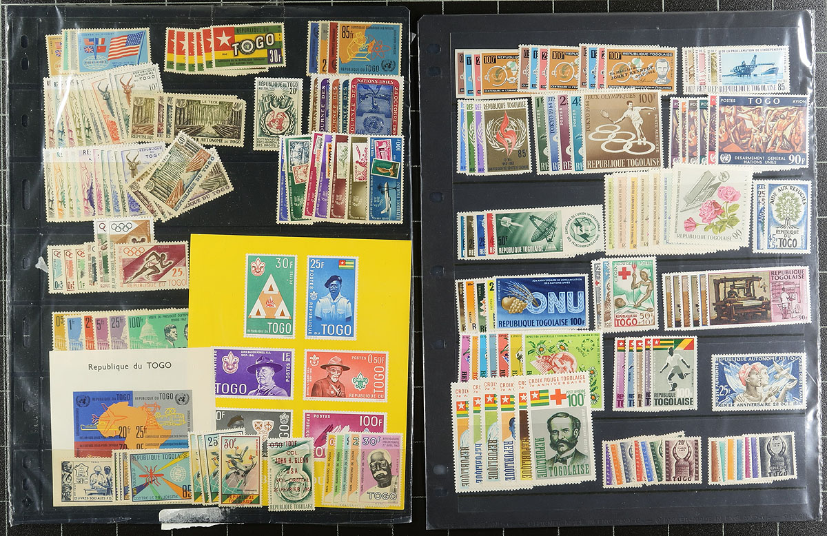 French Africa. Group of mint and used primarily French Colonies in Africa, 1950's-1970's, containing many hundreds of stamps in roughly 12 stock or album pages, and a few dealer cards. A quick check indicated better representation from Togo, Rwanda, Tunisia, and a few more, noting singles, several sets, and souvenir sheets, with some material cataloguing $5 to $10 each, leaving better finds for the dedicated collector. Our online photos show an overview and should be worth a look. Overall fine to very fine. Estimate =