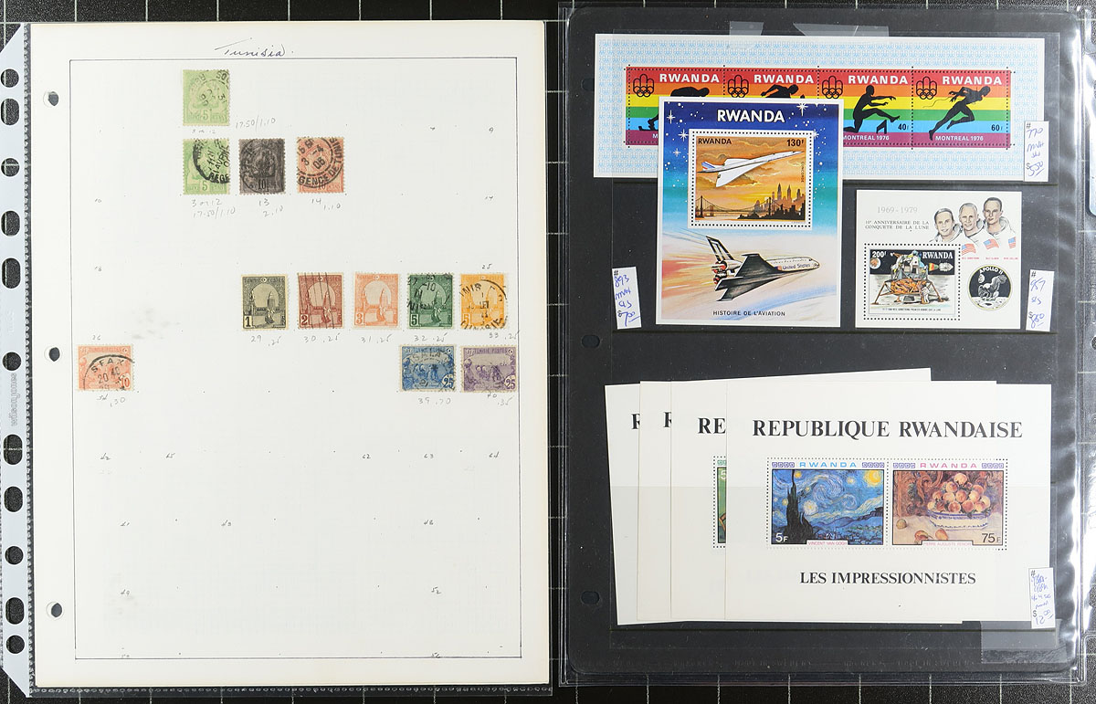 French Africa. Group of mint and used primarily French Colonies in Africa, 1950's-1970's, containing many hundreds of stamps in roughly 12 stock or album pages, and a few dealer cards. A quick check indicated better representation from Togo, Rwanda, Tunisia, and a few more, noting singles, several sets, and souvenir sheets, with some material cataloguing $5 to $10 each, leaving better finds for the dedicated collector. Our online photos show an overview and should be worth a look. Overall fine to very fine. Estimate =