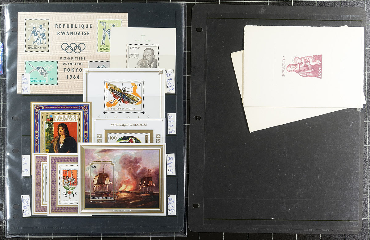 French Africa. Group of mint and used primarily French Colonies in Africa, 1950's-1970's, containing many hundreds of stamps in roughly 12 stock or album pages, and a few dealer cards. A quick check indicated better representation from Togo, Rwanda, Tunisia, and a few more, noting singles, several sets, and souvenir sheets, with some material cataloguing $5 to $10 each, leaving better finds for the dedicated collector. Our online photos show an overview and should be worth a look. Overall fine to very fine. Estimate =