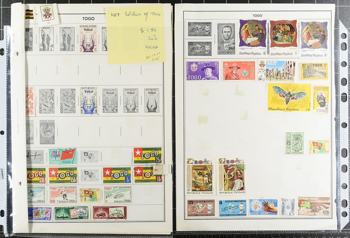 French Africa. Group of mint and used primarily French Colonies in Africa, 1950's-1970's, containing many hundreds of stamps in roughly 12 stock or album pages, and a few dealer cards. A quick check indicated better representation from Togo, Rwanda, Tunisia, and a few more, noting singles, several sets, and souvenir sheets, with some material cataloguing $5 to $10 each, leaving better finds for the dedicated collector. Our online photos show an overview and should be worth a look. Overall fine to very fine. Estimate =