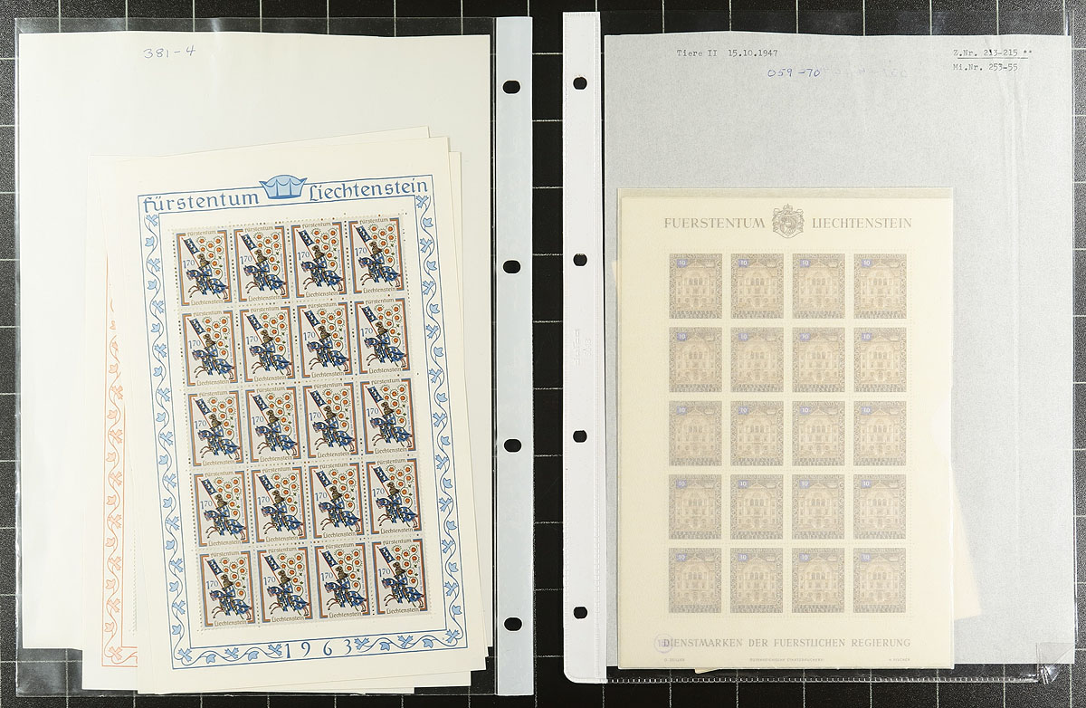 Collection of never hinged Liechtenstein sheets, 1940-1961, with 55 different sheets (72 in total), all in well described pages, including several sets ranging from Scott #165/368 and #O37/O70. A nice lot for collectors and dealers alike. Owner's older Scott US$1,595.00=
