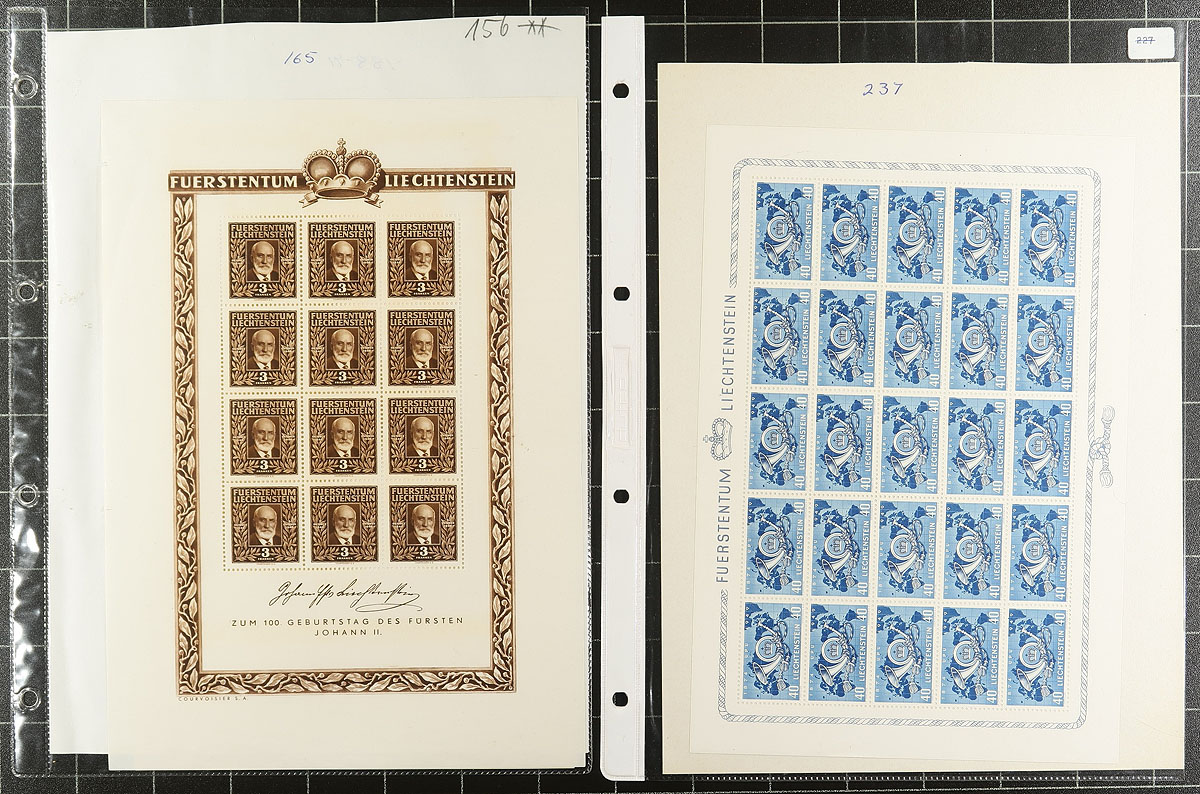 Collection of never hinged Liechtenstein sheets, 1940-1961, with 55 different sheets (72 in total), all in well described pages, including several sets ranging from Scott #165/368 and #O37/O70. A nice lot for collectors and dealers alike. Owner's older Scott US$1,595.00=