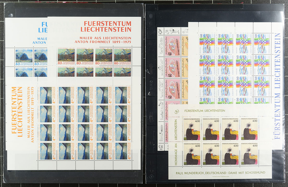 Group of roughly 30 never hinged Liechtenstein souvenir sheets and sheetlets, 1974-1999, in nine stock pages, generally ranging from Scott #557/1137. A lovely lot with several topical and thematic possibilities, overall very fine. Owners older 2012 Scott US$657.00 =