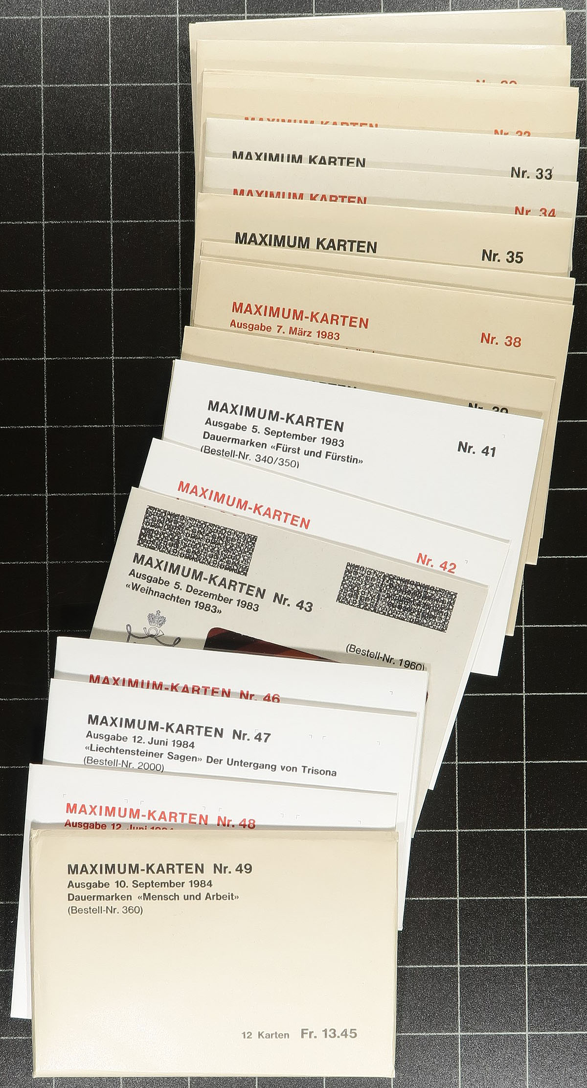 Lovely collection of roughly 210 Liechtenstein maximum cards, 1978-1991, almost all still in original post office envelopes, generally ranging from Scott #650/975. The collection appears to be complete in period, with mild duplication throughout. Original cost was over 1,400 Francs, and suitable for collectors and dealers alike. Estimate =
