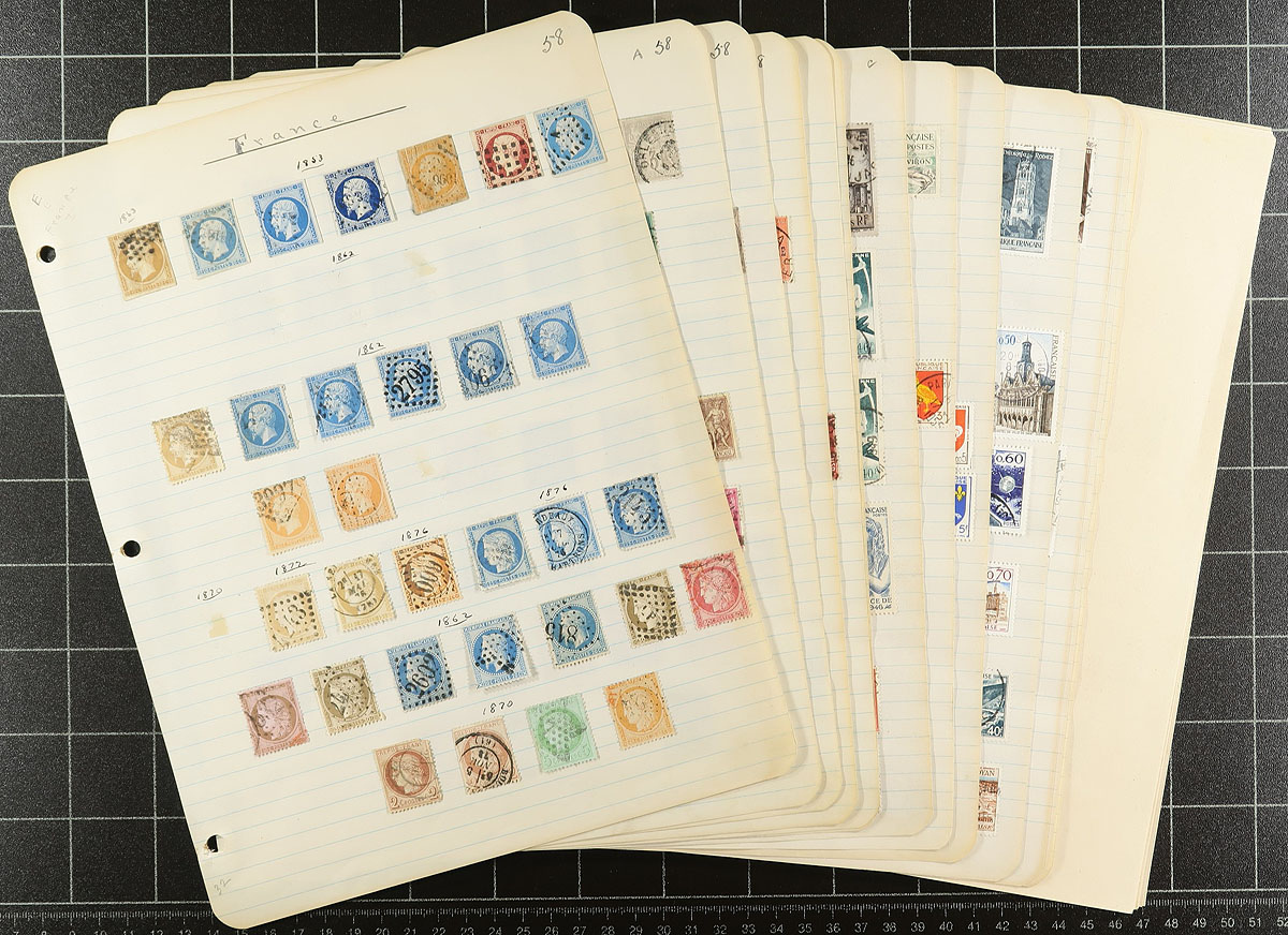 Collection of used France, 1853-1942, containing over 600 stamps on roughly 25 homemade and album pages. A nice starter collection, fairly well organized generally ranging from Scott #19/453, with a spot check indicating a few stamps and sets cataloguing $10 and up. Postmark interest includes a few Paris star cancels, numerals, cds, and a few other types, including a few dated "socked on the nose" town cancels. A nice start to this popular collecting area, a few small faults with a few of the early stamps, overall fine to very fine. Estimate =