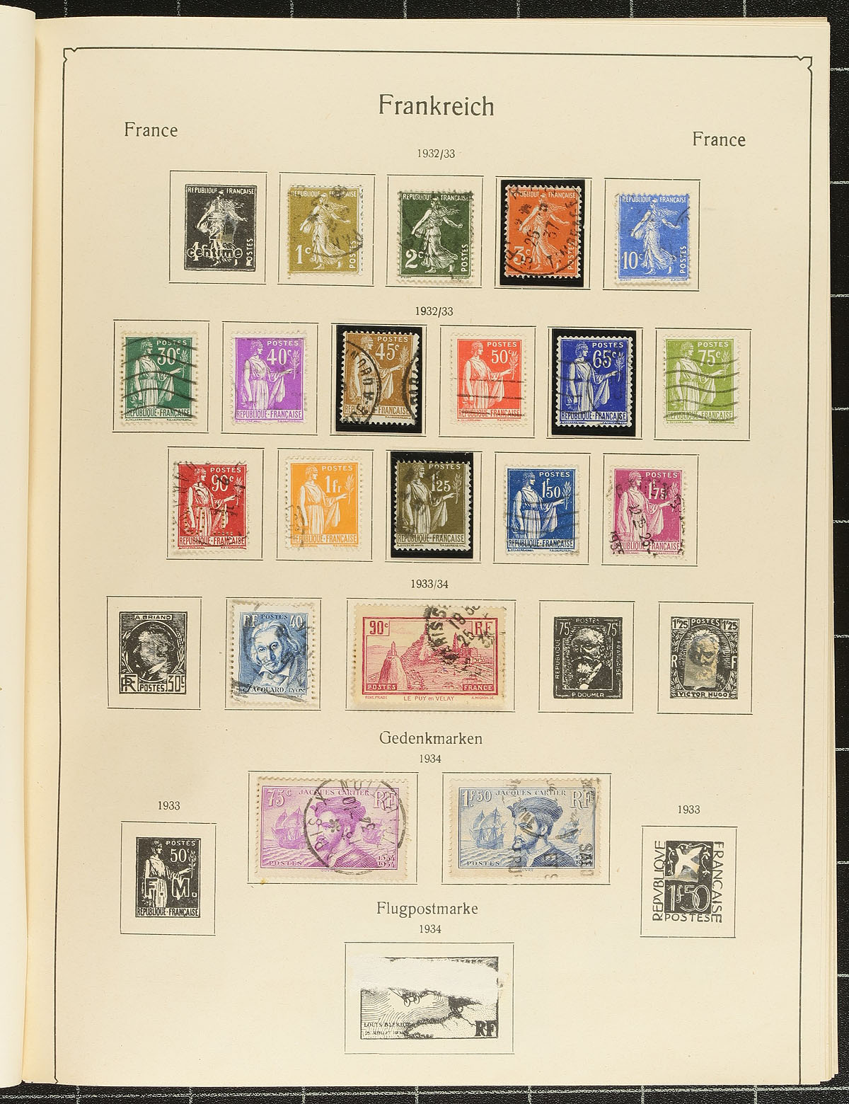 Collection of used France, 1853-1942, containing over 600 stamps on roughly 25 homemade and album pages. A nice starter collection, fairly well organized generally ranging from Scott #19/453, with a spot check indicating a few stamps and sets cataloguing $10 and up. Postmark interest includes a few Paris star cancels, numerals, cds, and a few other types, including a few dated "socked on the nose" town cancels. A nice start to this popular collecting area, a few small faults with a few of the early stamps, overall fine to very fine. Estimate =