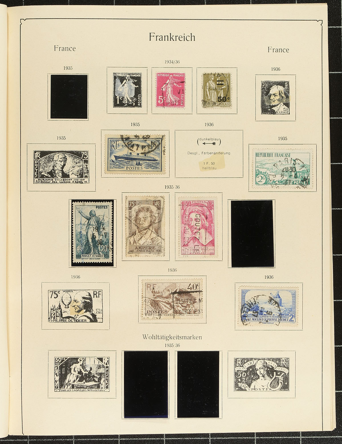 Collection of used France, 1853-1942, containing over 600 stamps on roughly 25 homemade and album pages. A nice starter collection, fairly well organized generally ranging from Scott #19/453, with a spot check indicating a few stamps and sets cataloguing $10 and up. Postmark interest includes a few Paris star cancels, numerals, cds, and a few other types, including a few dated "socked on the nose" town cancels. A nice start to this popular collecting area, a few small faults with a few of the early stamps, overall fine to very fine. Estimate =