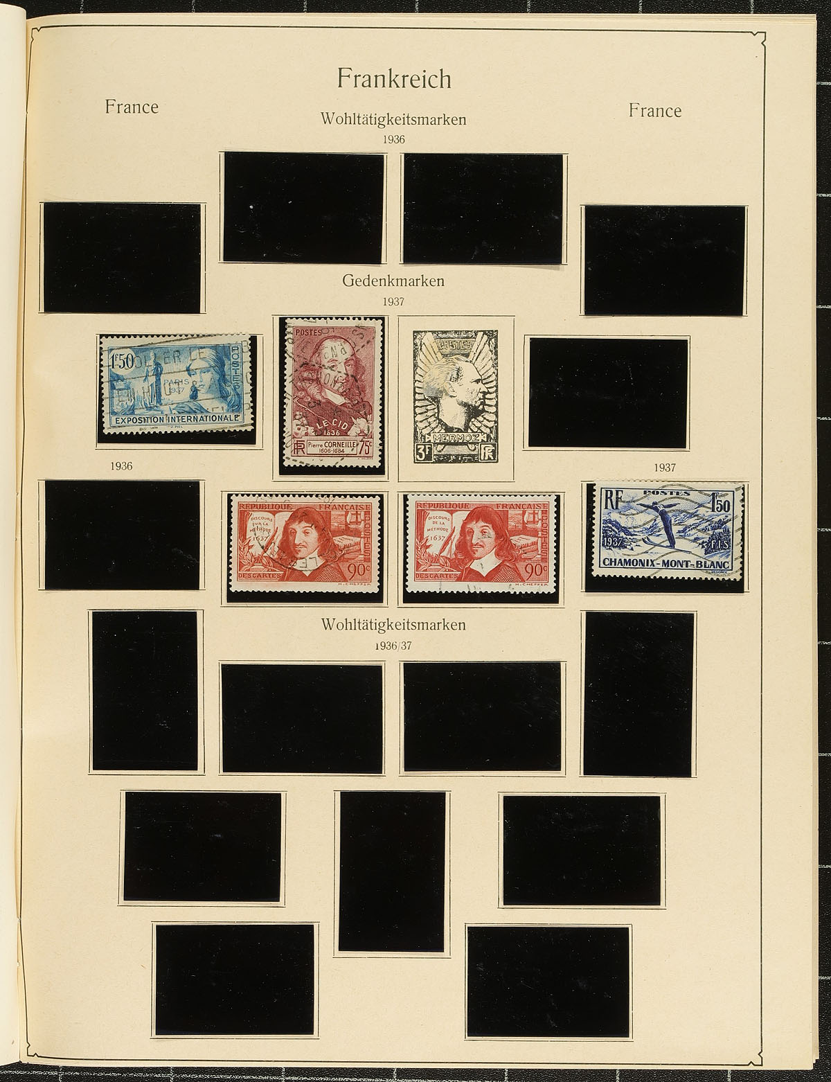 Collection of used France, 1853-1942, containing over 600 stamps on roughly 25 homemade and album pages. A nice starter collection, fairly well organized generally ranging from Scott #19/453, with a spot check indicating a few stamps and sets cataloguing $10 and up. Postmark interest includes a few Paris star cancels, numerals, cds, and a few other types, including a few dated "socked on the nose" town cancels. A nice start to this popular collecting area, a few small faults with a few of the early stamps, overall fine to very fine. Estimate =