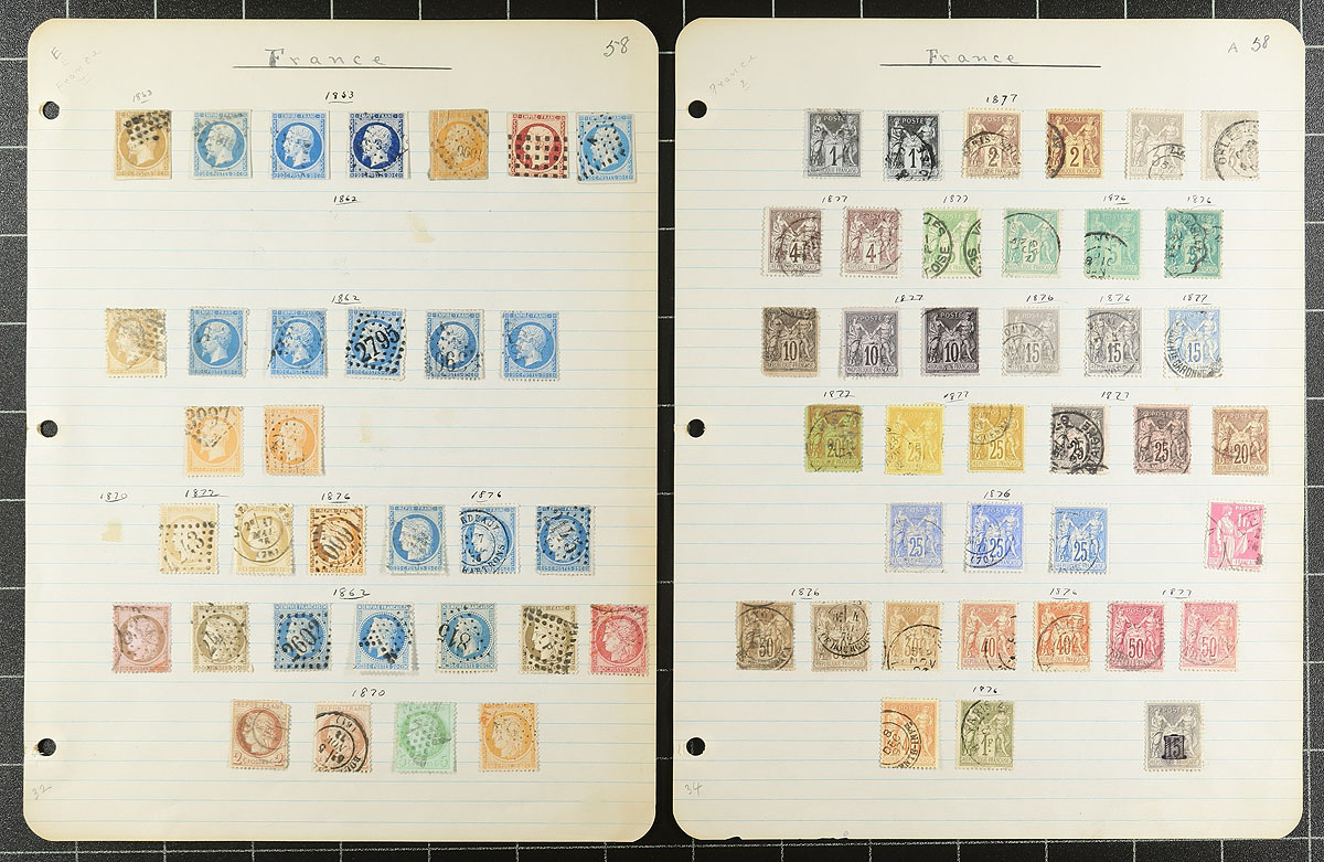 Collection of used France, 1853-1942, containing over 600 stamps on roughly 25 homemade and album pages. A nice starter collection, fairly well organized generally ranging from Scott #19/453, with a spot check indicating a few stamps and sets cataloguing $10 and up. Postmark interest includes a few Paris star cancels, numerals, cds, and a few other types, including a few dated "socked on the nose" town cancels. A nice start to this popular collecting area, a few small faults with a few of the early stamps, overall fine to very fine. Estimate =