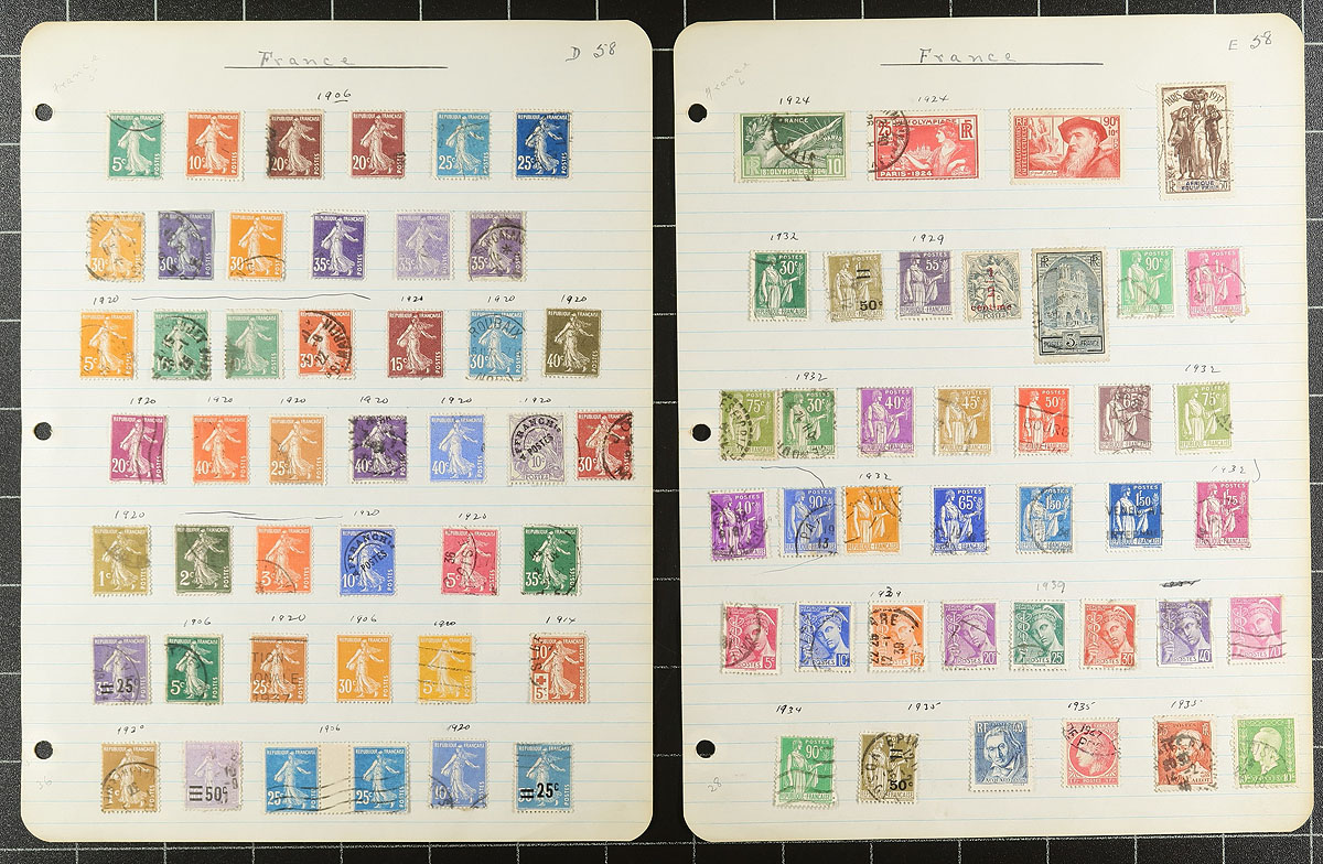 Collection of used France, 1853-1942, containing over 600 stamps on roughly 25 homemade and album pages. A nice starter collection, fairly well organized generally ranging from Scott #19/453, with a spot check indicating a few stamps and sets cataloguing $10 and up. Postmark interest includes a few Paris star cancels, numerals, cds, and a few other types, including a few dated "socked on the nose" town cancels. A nice start to this popular collecting area, a few small faults with a few of the early stamps, overall fine to very fine. Estimate =