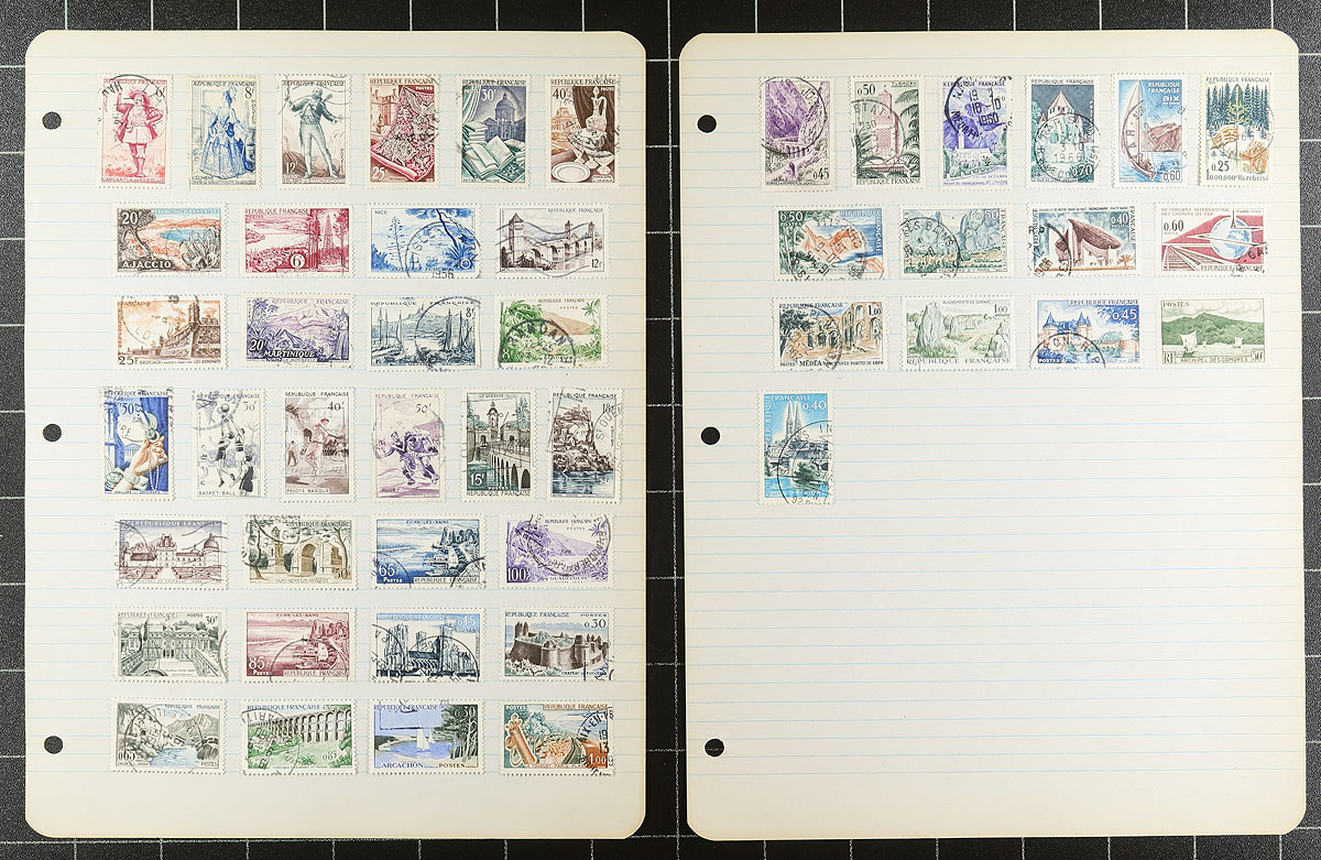 Collection of used France, 1853-1942, containing over 600 stamps on roughly 25 homemade and album pages. A nice starter collection, fairly well organized generally ranging from Scott #19/453, with a spot check indicating a few stamps and sets cataloguing $10 and up. Postmark interest includes a few Paris star cancels, numerals, cds, and a few other types, including a few dated "socked on the nose" town cancels. A nice start to this popular collecting area, a few small faults with a few of the early stamps, overall fine to very fine. Estimate =