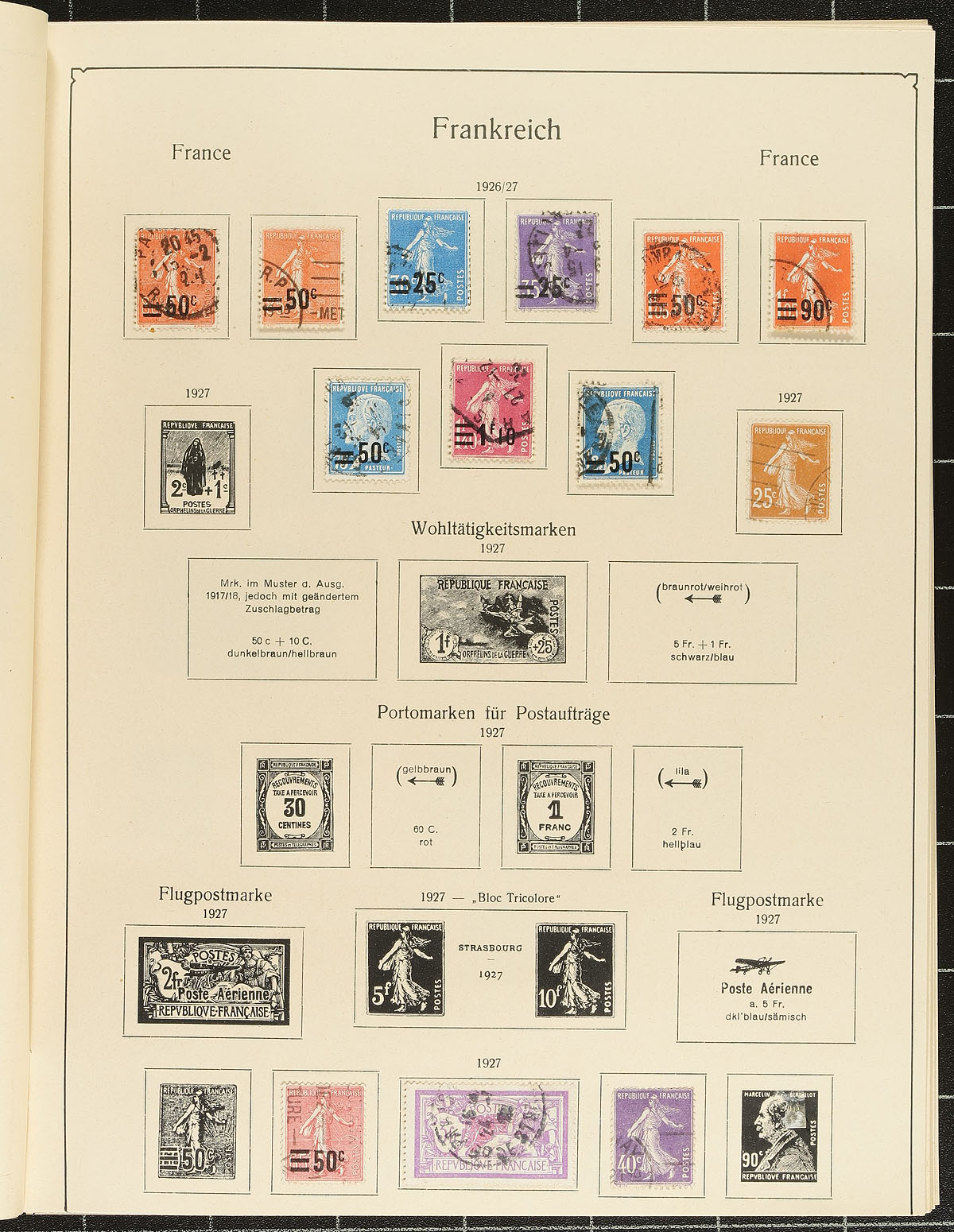 Collection of used France, 1853-1942, containing over 600 stamps on roughly 25 homemade and album pages. A nice starter collection, fairly well organized generally ranging from Scott #19/453, with a spot check indicating a few stamps and sets cataloguing $10 and up. Postmark interest includes a few Paris star cancels, numerals, cds, and a few other types, including a few dated "socked on the nose" town cancels. A nice start to this popular collecting area, a few small faults with a few of the early stamps, overall fine to very fine. Estimate =