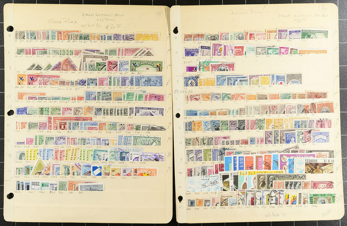 Large accumulation of primarily used South and Central America, 1880's-1960's, with a few thousand stamps in over 30 stock pages. A quick cursory check indicated better representation from Costa Rica, Nicaragua, Brazil, Colombia, along with a few other countries. Some of the material has been identified, with catalogue values for stamps generally $3 and under, leaving better finds, including better postmarks to the dedicated collector. A nice opportunity for worldwide collectors from this sometimes under-appreciated collecting area. Overall fine to very fine. Estimate =