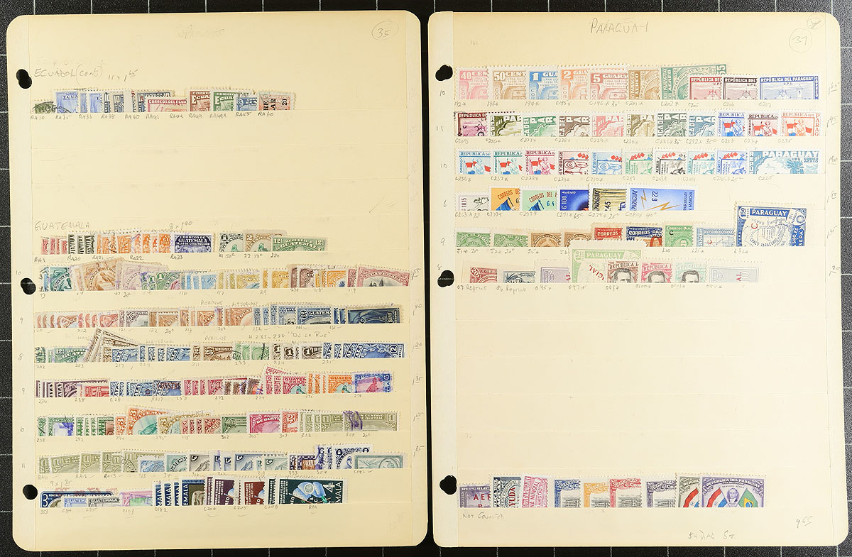 Large accumulation of primarily used South and Central America, 1880's-1960's, with a few thousand stamps in over 30 stock pages. A quick cursory check indicated better representation from Costa Rica, Nicaragua, Brazil, Colombia, along with a few other countries. Some of the material has been identified, with catalogue values for stamps generally $3 and under, leaving better finds, including better postmarks to the dedicated collector. A nice opportunity for worldwide collectors from this sometimes under-appreciated collecting area. Overall fine to very fine. Estimate =