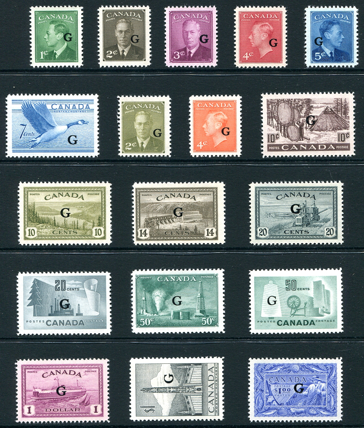 Complete mint Never Hinged run of all the "G" overprinted officials, 1950-1963 period issues. Includes the Official Airmail and Official Special Delivery stamps. Unitrade $575.00 for this quality. Nice to get them all at once. 2025 Scott US$325.30 =