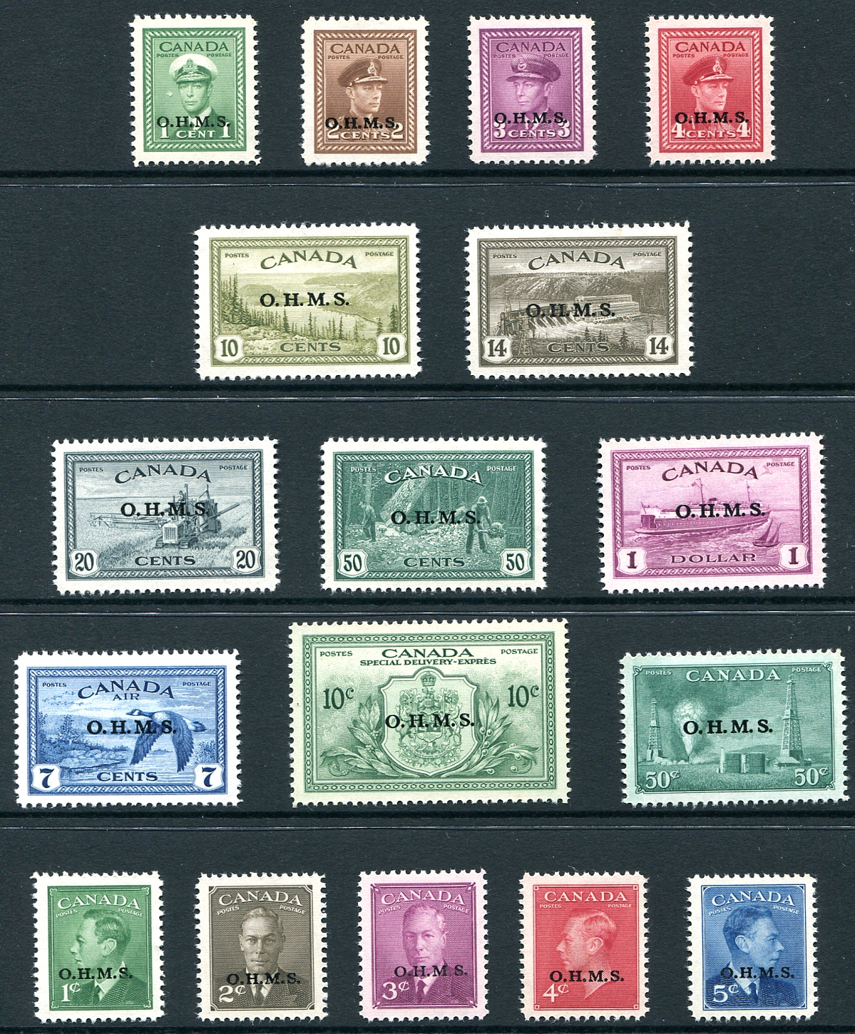 Complete fresh, sound and select quality VF mint NH complete run of all the 1949-1950 issue "OHMS" overprinted Officials including key-value 50c Lumbering as well as the Official Airmail and Official Special Delivery stamps. A superior quality group, very hard to assemble in VF mint NH condition. 2025 Scott US$435.05 =