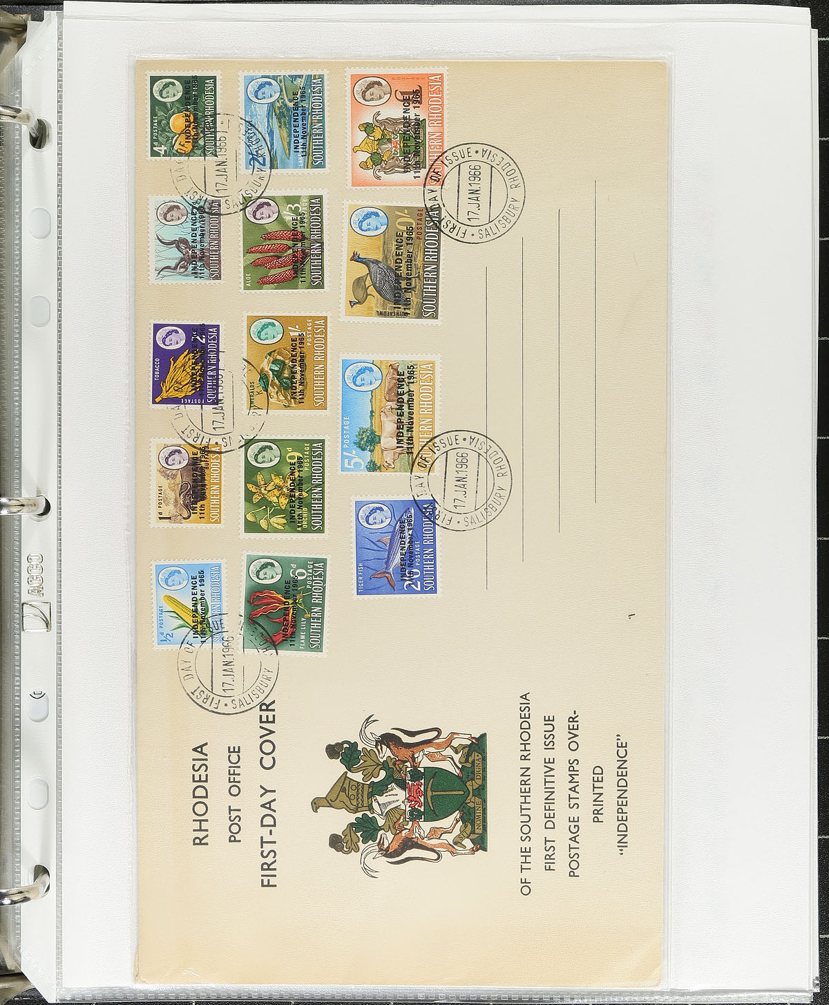 Specialized collection of Rhodesia and Zimbabwe town cancels, containing many hundreds of stamps on piece and a few covers in a thick binder. This specialized collection contains roughly 125 different towns ranging from H to Z, with at least one cover or a stamp representing each town including Inyati Mine, Mashava, Mount Selinda, Matoppos, Matebeleland, Queens Mine, Sebunga Poort, and much more, with material ranging from the 1890’s to the 1990’s. Almost all the cancels have been identified, and some pages having additional post office information, including scans of cancel types, locations, maps for each post office, and more. A nice specialized collection for the cancel collector, showing a few sample pages. Estimate =