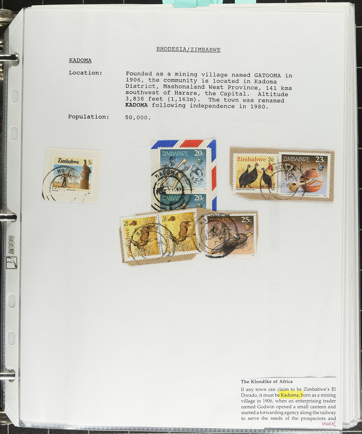 Specialized collection of Rhodesia and Zimbabwe town cancels, containing many hundreds of stamps on piece and a few covers in a thick binder. This specialized collection contains roughly 125 different towns ranging from H to Z, with at least one cover or a stamp representing each town including Inyati Mine, Mashava, Mount Selinda, Matoppos, Matebeleland, Queens Mine, Sebunga Poort, and much more, with material ranging from the 1890’s to the 1990’s. Almost all the cancels have been identified, and some pages having additional post office information, including scans of cancel types, locations, maps for each post office, and more. A nice specialized collection for the cancel collector, showing a few sample pages. Estimate =