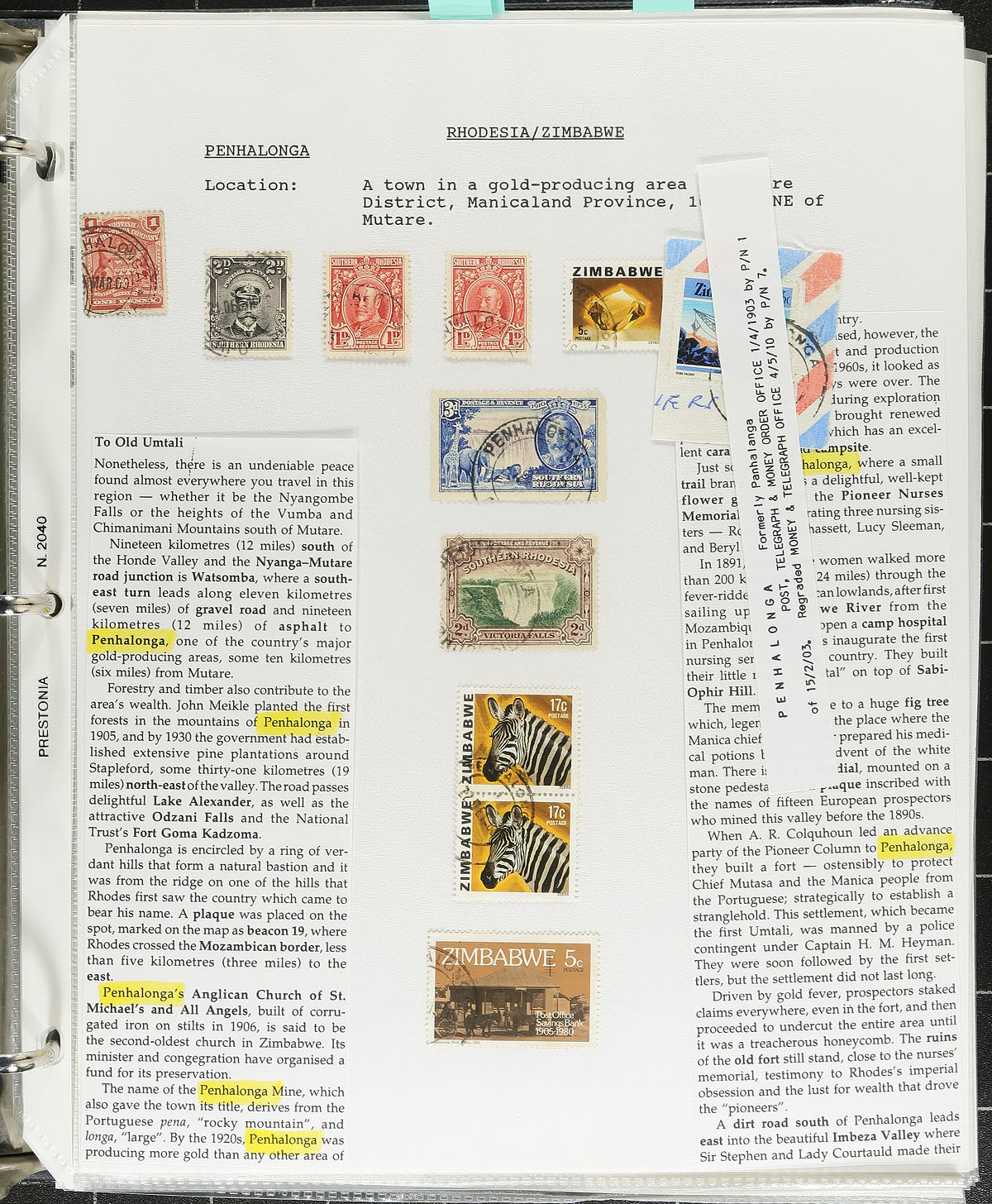 Specialized collection of Rhodesia and Zimbabwe town cancels, containing many hundreds of stamps on piece and a few covers in a thick binder. This specialized collection contains roughly 125 different towns ranging from H to Z, with at least one cover or a stamp representing each town including Inyati Mine, Mashava, Mount Selinda, Matoppos, Matebeleland, Queens Mine, Sebunga Poort, and much more, with material ranging from the 1890’s to the 1990’s. Almost all the cancels have been identified, and some pages having additional post office information, including scans of cancel types, locations, maps for each post office, and more. A nice specialized collection for the cancel collector, showing a few sample pages. Estimate =