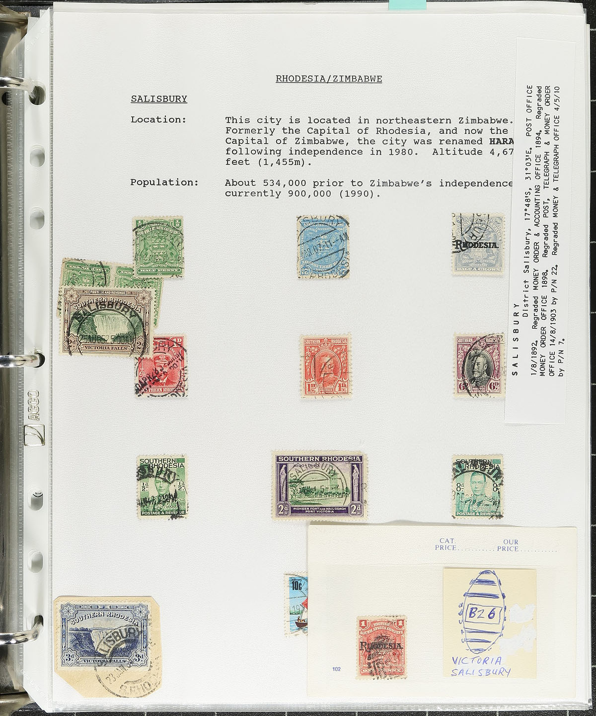 Specialized collection of Rhodesia and Zimbabwe town cancels, containing many hundreds of stamps on piece and a few covers in a thick binder. This specialized collection contains roughly 125 different towns ranging from H to Z, with at least one cover or a stamp representing each town including Inyati Mine, Mashava, Mount Selinda, Matoppos, Matebeleland, Queens Mine, Sebunga Poort, and much more, with material ranging from the 1890’s to the 1990’s. Almost all the cancels have been identified, and some pages having additional post office information, including scans of cancel types, locations, maps for each post office, and more. A nice specialized collection for the cancel collector, showing a few sample pages. Estimate =