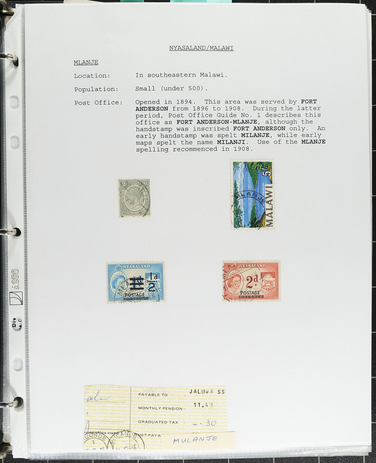 Specialized collection of Malawi and some Nyasaland town cancels, containing a few hundred stamps on piece and a few covers in a thick binder. This specialized collection contains roughly 60 different towns ranging from M to Z, with at least one cover or a stamp representing each town including Mbiza, Monkey Bay, Malindi, Mlangeni, Makwasa, Sharpe Vale, and much more, with material ranging from the 1890’s to the 1990’s. Almost all the cancels have been identified, and some pages having additional post office information, including scans of cancel types, locations, maps for each post office, and more. A nice specialized collection for the cancel collector, showing a few sample pages. Estimate =