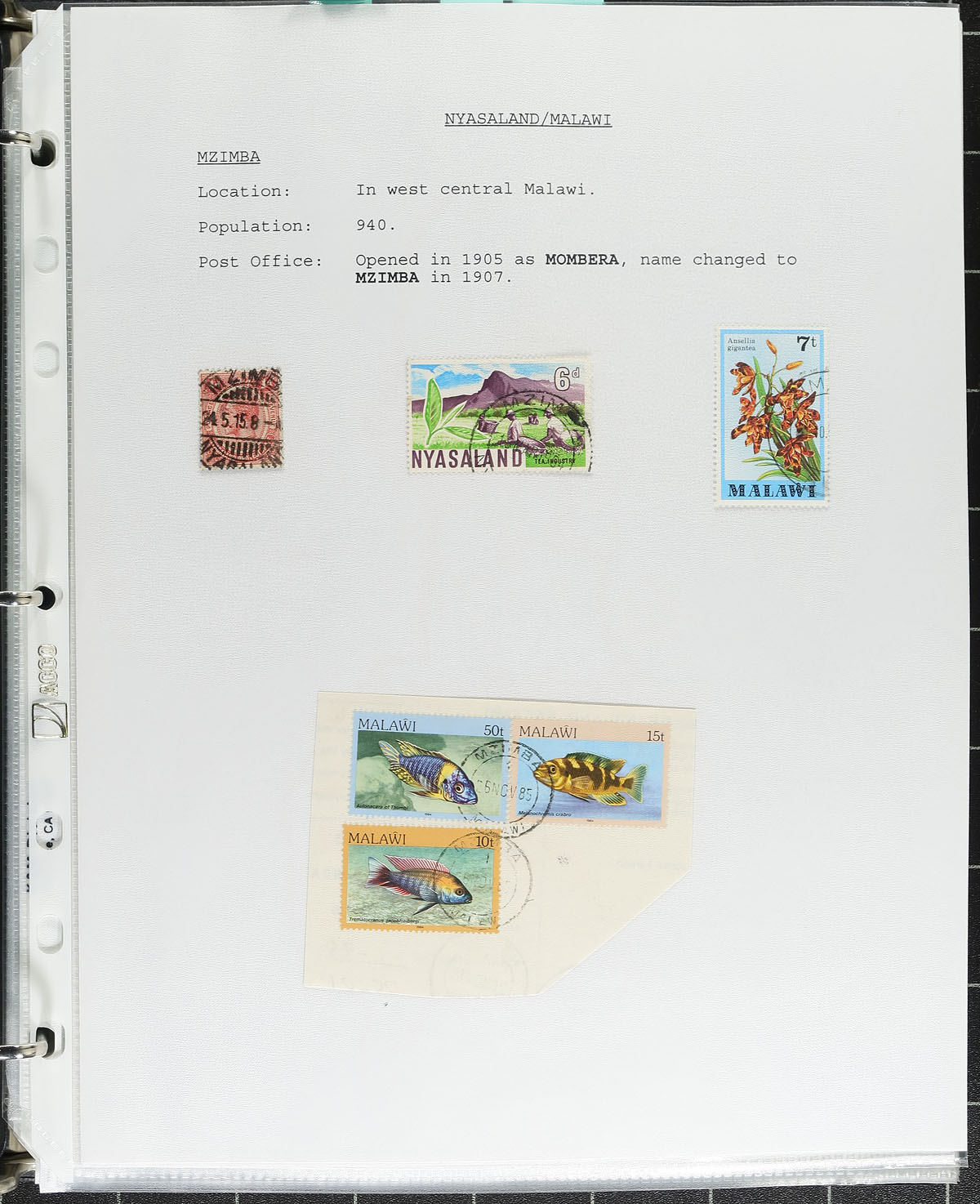Specialized collection of Malawi and some Nyasaland town cancels, containing a few hundred stamps on piece and a few covers in a thick binder. This specialized collection contains roughly 60 different towns ranging from M to Z, with at least one cover or a stamp representing each town including Mbiza, Monkey Bay, Malindi, Mlangeni, Makwasa, Sharpe Vale, and much more, with material ranging from the 1890’s to the 1990’s. Almost all the cancels have been identified, and some pages having additional post office information, including scans of cancel types, locations, maps for each post office, and more. A nice specialized collection for the cancel collector, showing a few sample pages. Estimate =