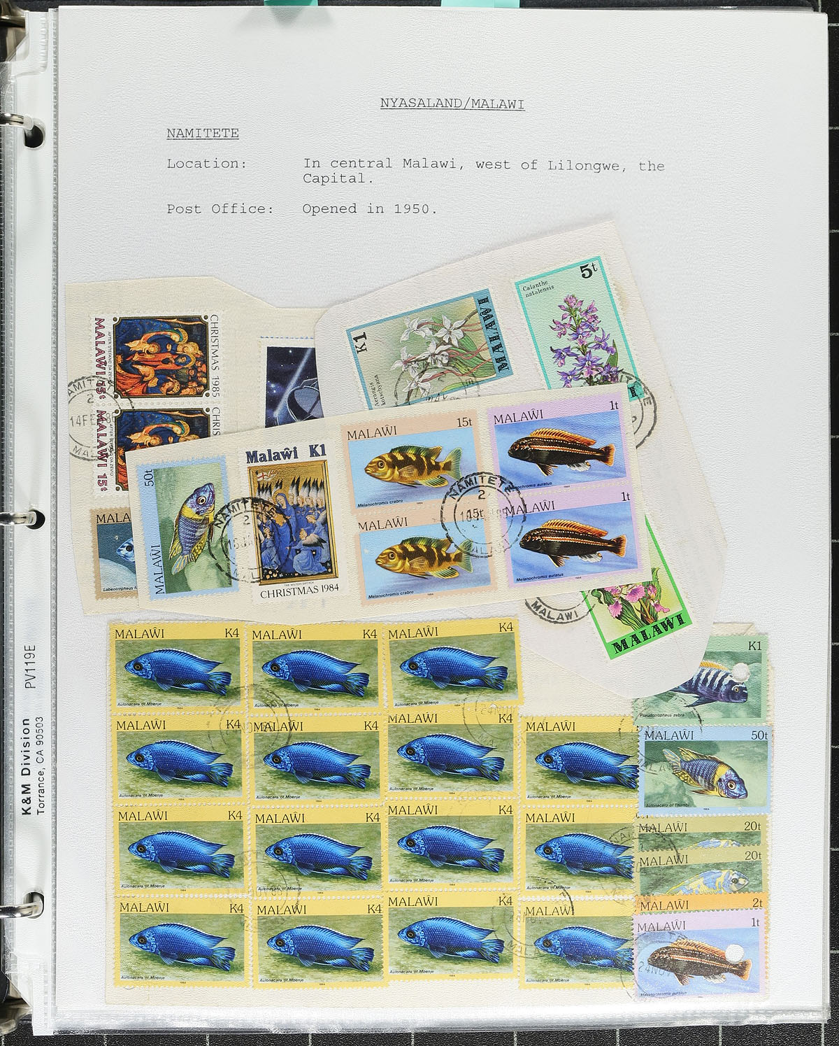 Specialized collection of Malawi and some Nyasaland town cancels, containing a few hundred stamps on piece and a few covers in a thick binder. This specialized collection contains roughly 60 different towns ranging from M to Z, with at least one cover or a stamp representing each town including Mbiza, Monkey Bay, Malindi, Mlangeni, Makwasa, Sharpe Vale, and much more, with material ranging from the 1890’s to the 1990’s. Almost all the cancels have been identified, and some pages having additional post office information, including scans of cancel types, locations, maps for each post office, and more. A nice specialized collection for the cancel collector, showing a few sample pages. Estimate =