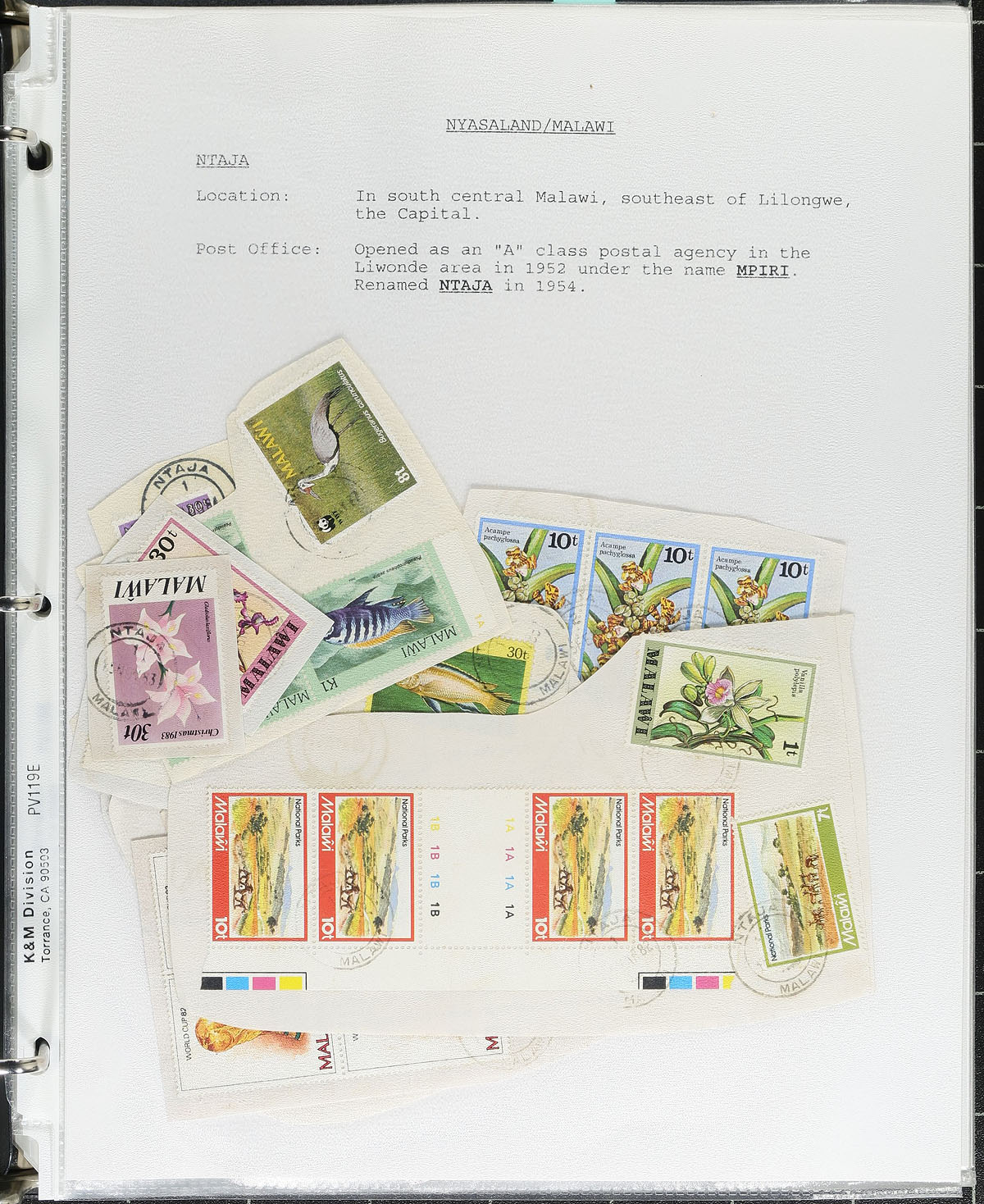 Specialized collection of Malawi and some Nyasaland town cancels, containing a few hundred stamps on piece and a few covers in a thick binder. This specialized collection contains roughly 60 different towns ranging from M to Z, with at least one cover or a stamp representing each town including Mbiza, Monkey Bay, Malindi, Mlangeni, Makwasa, Sharpe Vale, and much more, with material ranging from the 1890’s to the 1990’s. Almost all the cancels have been identified, and some pages having additional post office information, including scans of cancel types, locations, maps for each post office, and more. A nice specialized collection for the cancel collector, showing a few sample pages. Estimate =