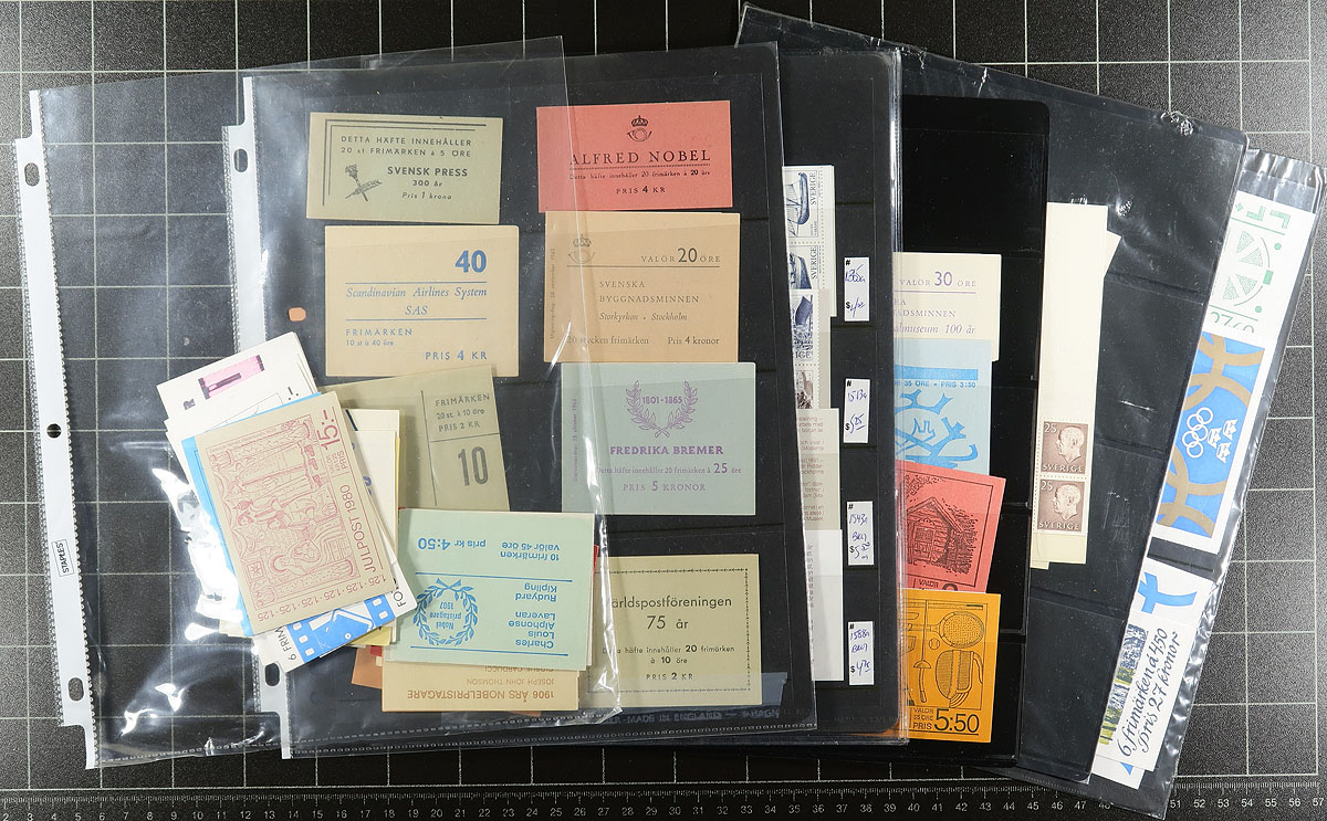 Group of roughly 95 never hinged Sweden compete booklets, 1940’s-1990’s. in roughly 12 stock pages, and a few loose booklets. A few of the items have been identified and catalogued, with a few in the $10 range and up. Unchecked for varieties, printings, etc, ideal for the Sweden or booklet collector. Owner’s older 2014 Scott US$769.00 =