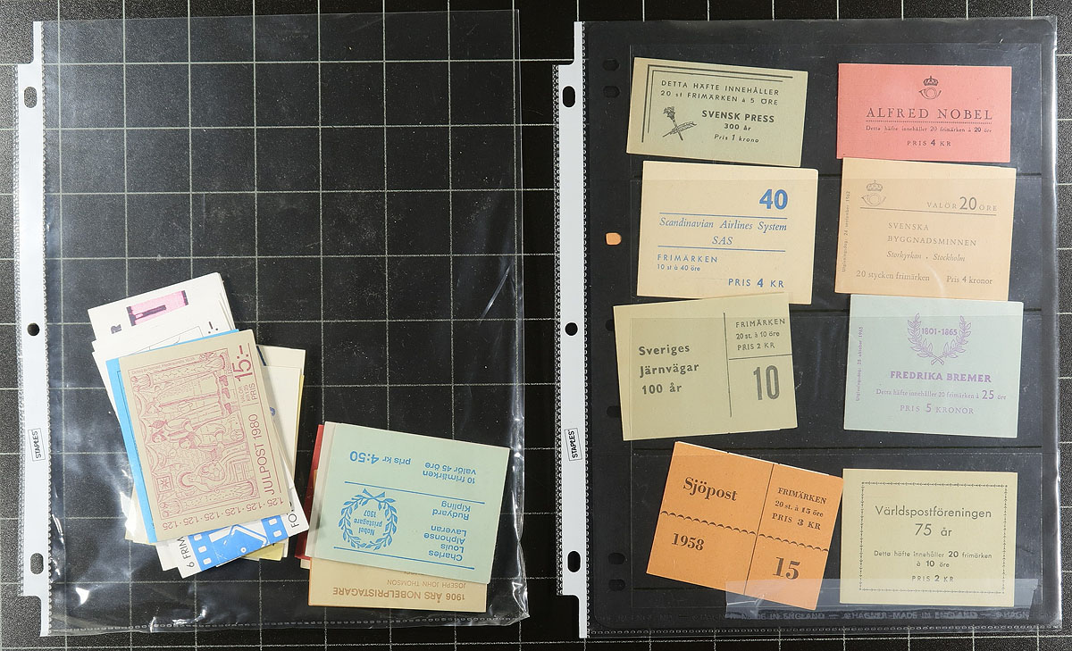 Group of roughly 95 never hinged Sweden compete booklets, 1940’s-1990’s. in roughly 12 stock pages, and a few loose booklets. A few of the items have been identified and catalogued, with a few in the $10 range and up. Unchecked for varieties, printings, etc, ideal for the Sweden or booklet collector. Owner’s older 2014 Scott US$769.00 =