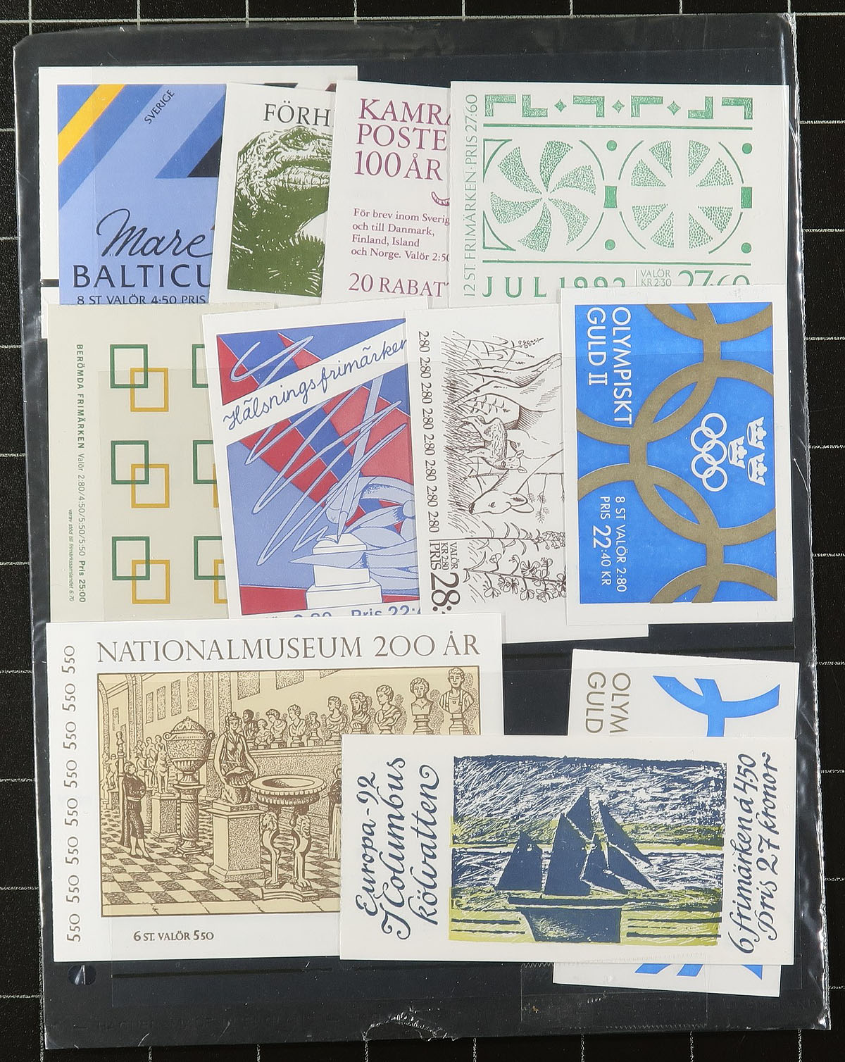 Group of roughly 95 never hinged Sweden compete booklets, 1940’s-1990’s. in roughly 12 stock pages, and a few loose booklets. A few of the items have been identified and catalogued, with a few in the $10 range and up. Unchecked for varieties, printings, etc, ideal for the Sweden or booklet collector. Owner’s older 2014 Scott US$769.00 =