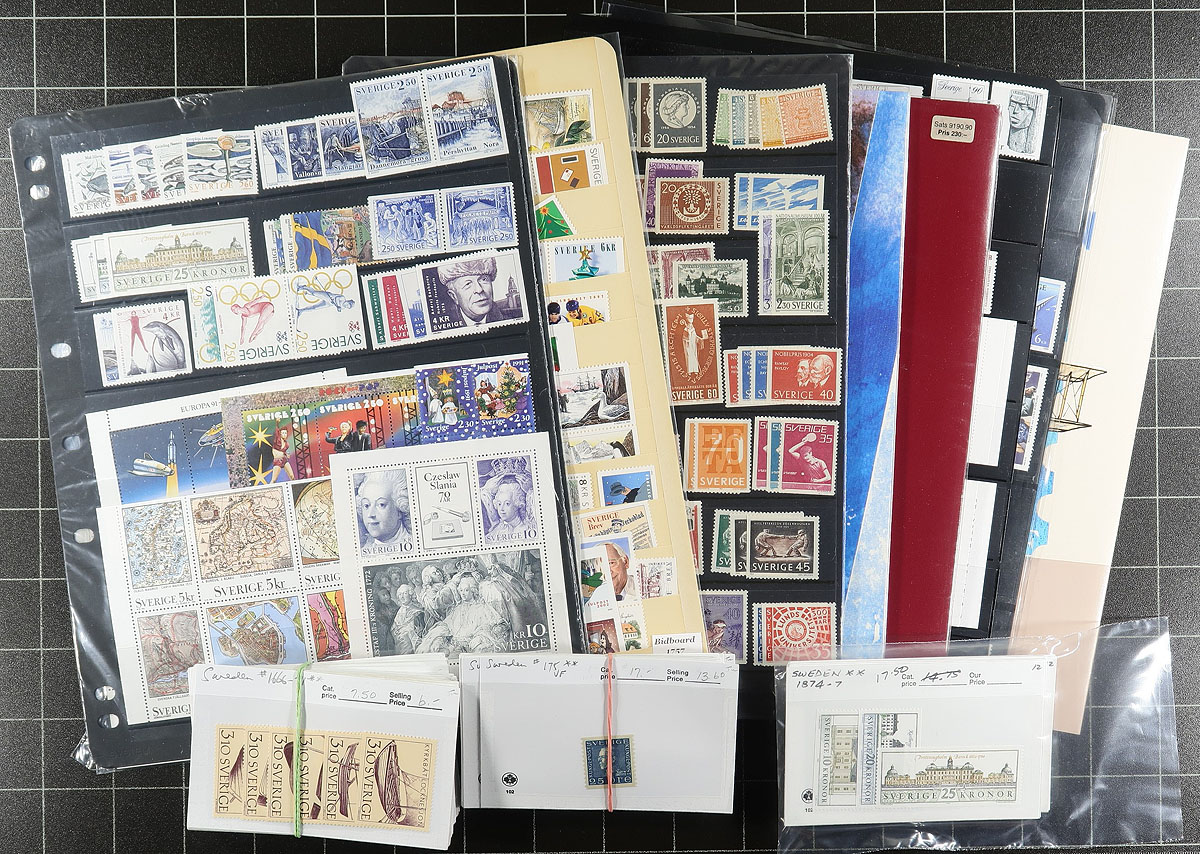 Lovely collection of primarily never hinged Sweden, 1950’s-2002, containing many hundreds of stamps in a variety of formats, including 6 stock pages, roughly 50x 102 cards, and 3 complete annual collections (1991, 1992, 2001). The collection generally ranges from Scott #498/2427, noting several sets, and a few souvenir sheets. A lovely lot for collectors and dealers alike. Owner’s older 2012 Scott US$1,286.00 =