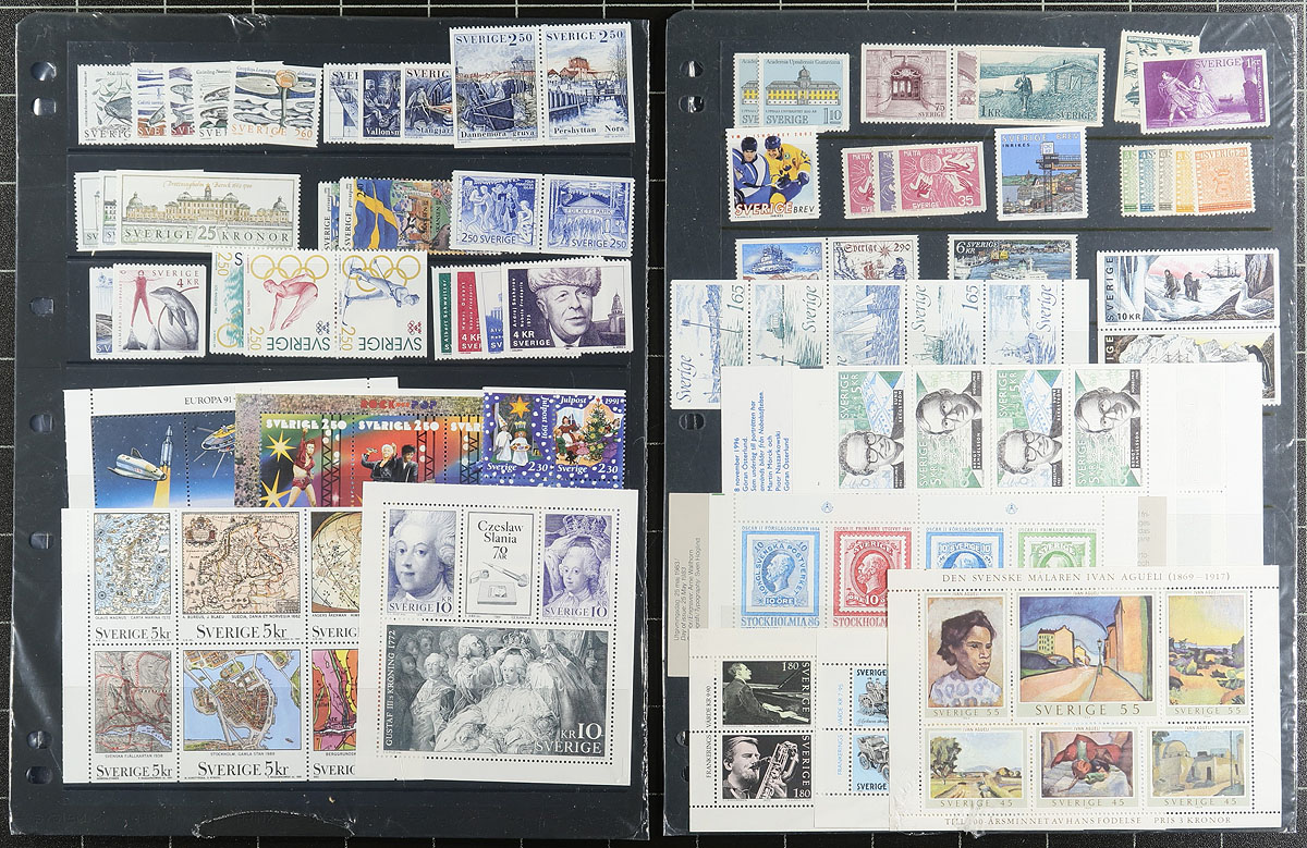 Lovely collection of primarily never hinged Sweden, 1950’s-2002, containing many hundreds of stamps in a variety of formats, including 6 stock pages, roughly 50x 102 cards, and 3 complete annual collections (1991, 1992, 2001). The collection generally ranges from Scott #498/2427, noting several sets, and a few souvenir sheets. A lovely lot for collectors and dealers alike. Owner’s older 2012 Scott US$1,286.00 =