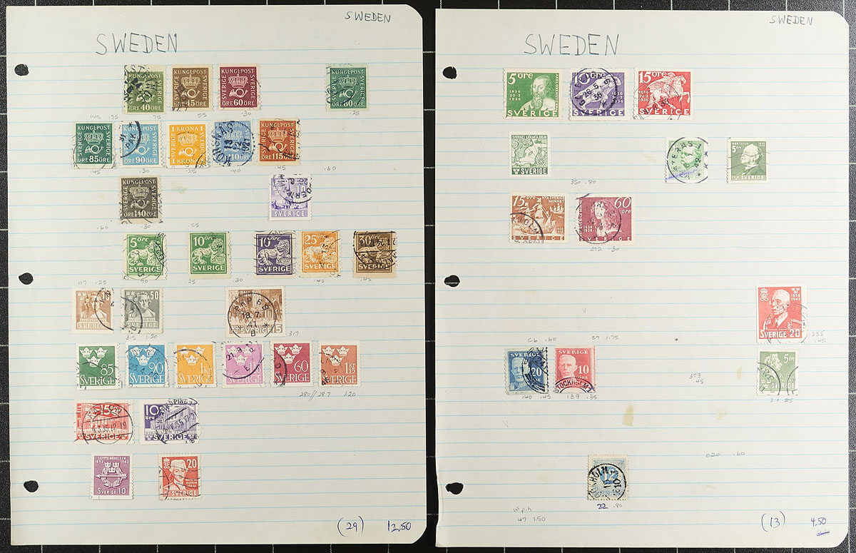 Nice collection / accumulation of used Sweden, 1858-2012, containing over 2,000 stamps in roughly 25 stock or album pages. The collection generally ranges from Scott #8/2692, including several sets, and book of the book issues, with a fairly decent selection of more modern issues. Postmark interest include cds, along with a few other types, including some "socked on the nose" town cancels. A nice lot for the Sweden or the worldwide postmark collector, a few faults to be expected, overall fine to very fine. Owner’s older 2012 Scott US$1,726.00 =
