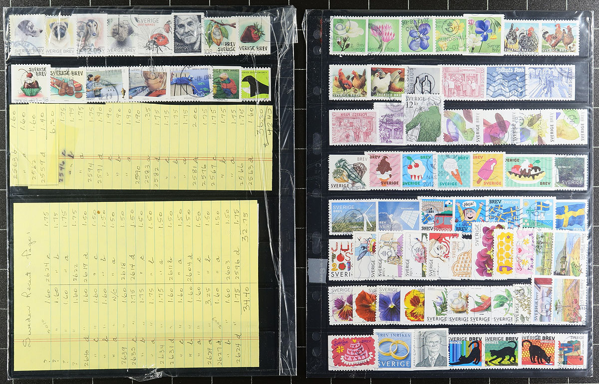 Nice collection / accumulation of used Sweden, 1858-2012, containing over 2,000 stamps in roughly 25 stock or album pages. The collection generally ranges from Scott #8/2692, including several sets, and book of the book issues, with a fairly decent selection of more modern issues. Postmark interest include cds, along with a few other types, including some "socked on the nose" town cancels. A nice lot for the Sweden or the worldwide postmark collector, a few faults to be expected, overall fine to very fine. Owner’s older 2012 Scott US$1,726.00 =
