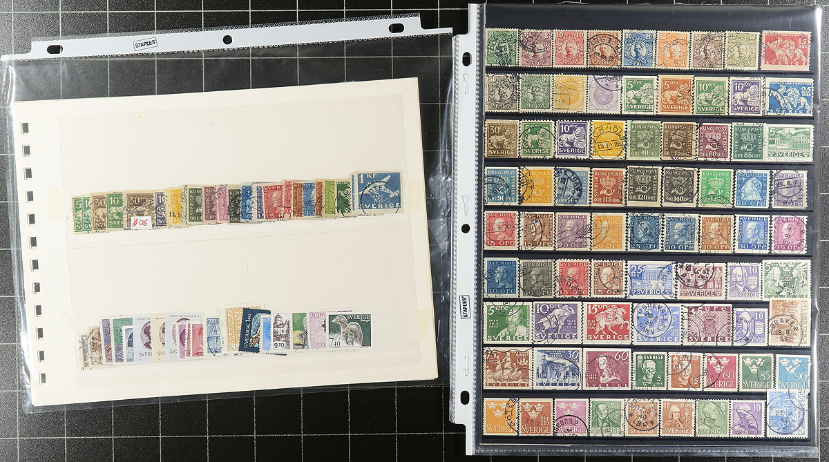 Nice collection / accumulation of used Sweden, 1858-2012, containing over 2,000 stamps in roughly 25 stock or album pages. The collection generally ranges from Scott #8/2692, including several sets, and book of the book issues, with a fairly decent selection of more modern issues. Postmark interest include cds, along with a few other types, including some "socked on the nose" town cancels. A nice lot for the Sweden or the worldwide postmark collector, a few faults to be expected, overall fine to very fine. Owner’s older 2012 Scott US$1,726.00 =