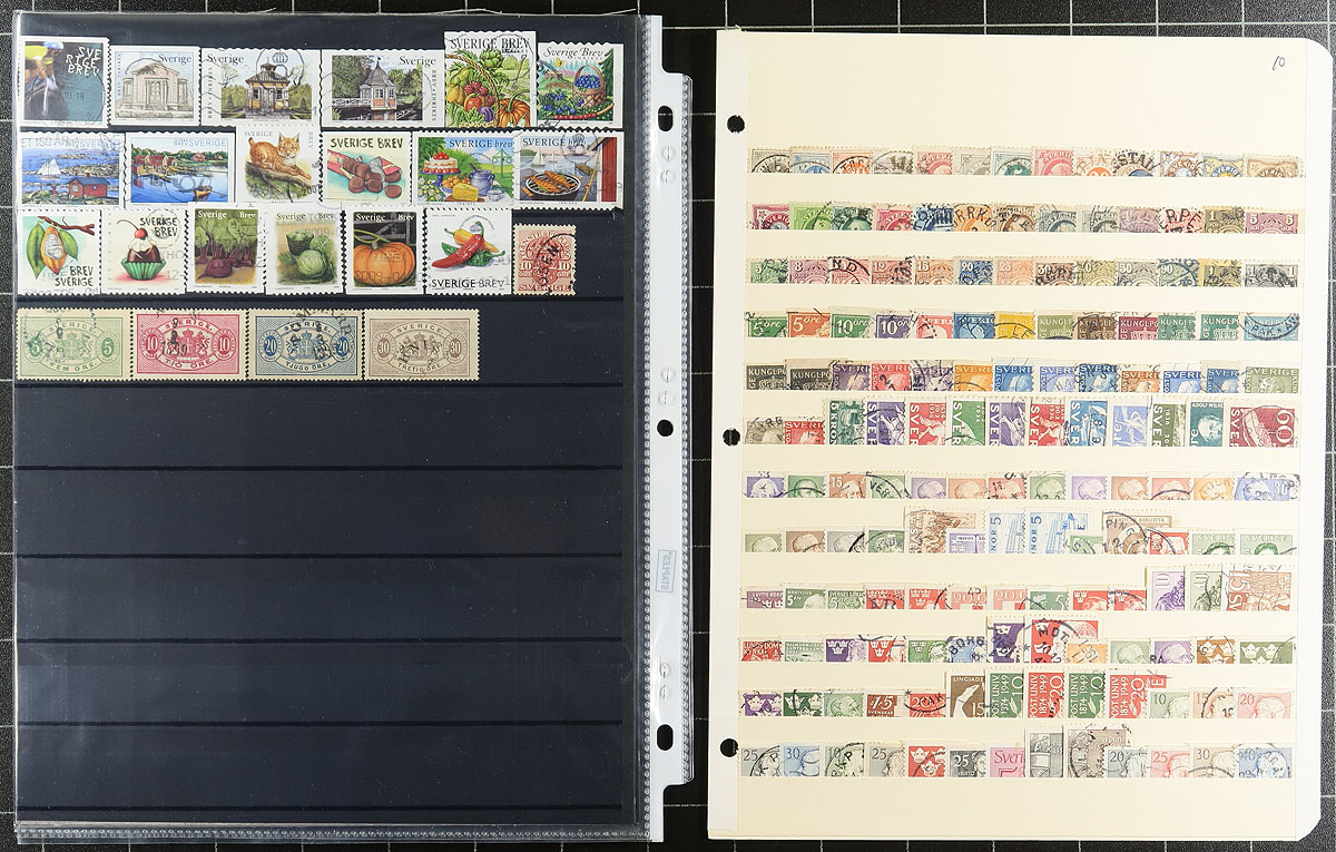 Nice collection / accumulation of used Sweden, 1858-2012, containing over 2,000 stamps in roughly 25 stock or album pages. The collection generally ranges from Scott #8/2692, including several sets, and book of the book issues, with a fairly decent selection of more modern issues. Postmark interest include cds, along with a few other types, including some "socked on the nose" town cancels. A nice lot for the Sweden or the worldwide postmark collector, a few faults to be expected, overall fine to very fine. Owner’s older 2012 Scott US$1,726.00 =