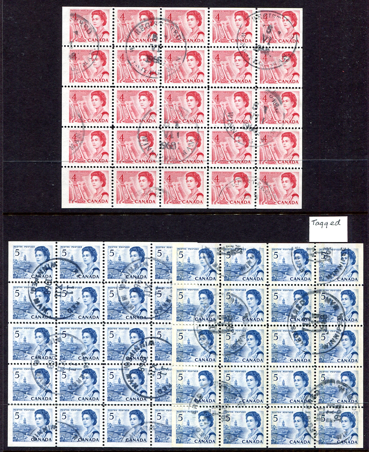 Used Block Accumulation. A high-quality offering of better used blocks, from the George V Admiral era, up to 1970 EXPO issue. A neat assembly of 41 blocks (of four and larger) including $1.00 Admiral, War Issues, $1.00 Fisheries (x3), $1.00 Export (block of 10), Medallion, Confederation, $1.00 Chateau Ramezay, 1933 UPU and QEII Centennial "Cell" blocks etc. Take a good look at the scans to appreciate the scope of the lot. Used block collectors will appreciated how hard some of these are to acquire. Estimate =