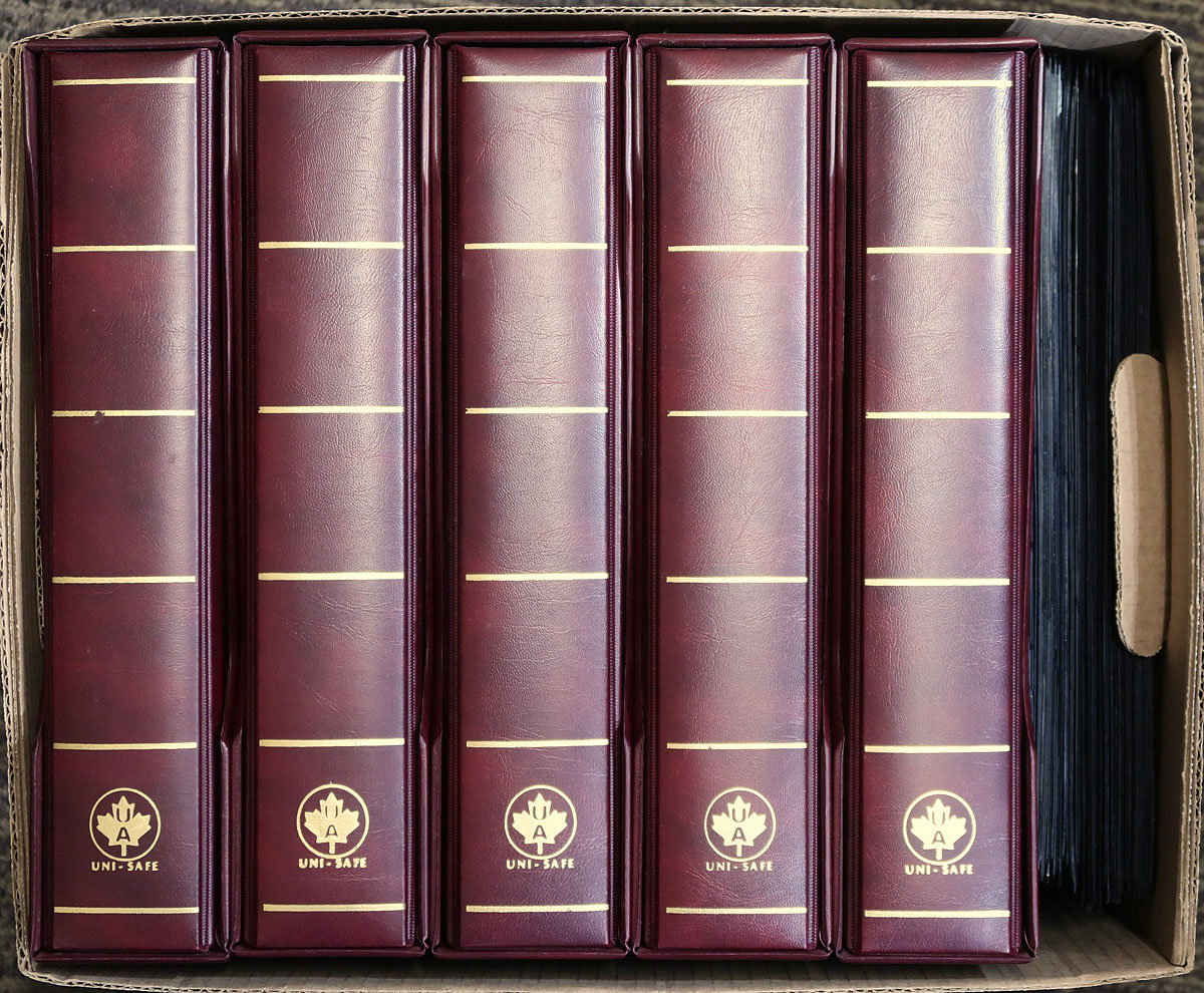 Group of 5x burgundy coloured Unisafe brand deluxe 3-ring binders, with matching slipcases. A handsome group of binders, accompanied by 80 various used stockpages, mostly Vario or Hagner brands. Estimate =