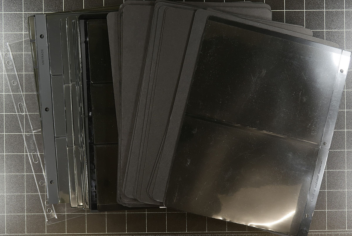 Group of 5x burgundy coloured Unisafe brand deluxe 3-ring binders, with matching slipcases. A handsome group of binders, accompanied by 80 various used stockpages, mostly Vario or Hagner brands. Estimate =