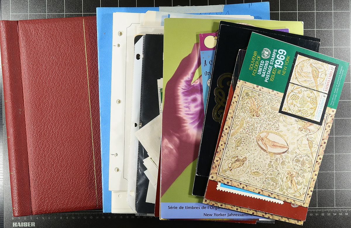 Accumulation of primarily never hinged United Nations stamps and sheets, 1950's-1990's, with many hundreds of stamps in a variety of formats. The lot includes a collection ranging from the 1950's to the 1970's in a hingeless Lighthouse album (includes some material from Switzerland), flag sheets on album pages, blocks and souvenir sheets in stock pages, a handful of souvenir folders, Vienna issues in hingeless album pages, and much more. Owner's Scott 2017 catalogue value in excess of $500.00 (some material has not been previously catalogued), leaving finds for all, ideal for topical and thematic collectors noting several suitable subjects. Overall fine to very fine. Estimate =