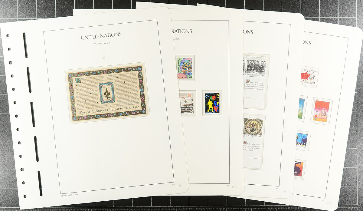 Accumulation of primarily never hinged United Nations stamps and sheets, 1950's-1990's, with many hundreds of stamps in a variety of formats. The lot includes a collection ranging from the 1950's to the 1970's in a hingeless Lighthouse album (includes some material from Switzerland), flag sheets on album pages, blocks and souvenir sheets in stock pages, a handful of souvenir folders, Vienna issues in hingeless album pages, and much more. Owner's Scott 2017 catalogue value in excess of $500.00 (some material has not been previously catalogued), leaving finds for all, ideal for topical and thematic collectors noting several suitable subjects. Overall fine to very fine. Estimate =