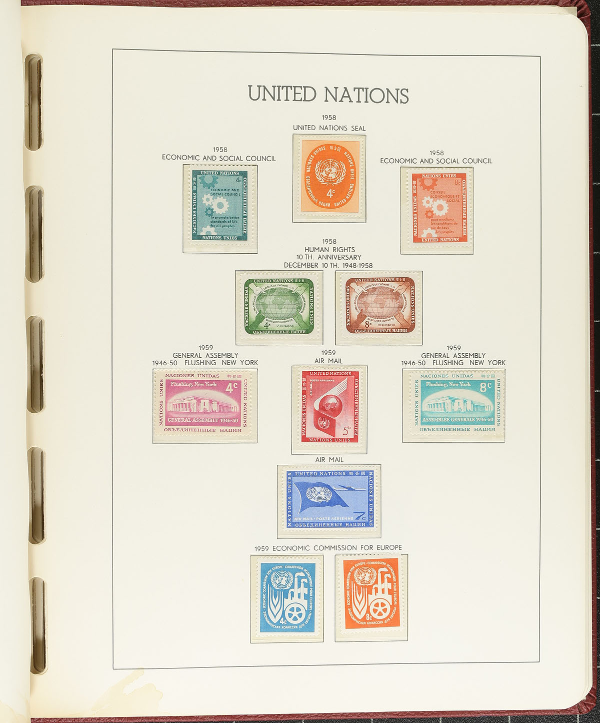 Accumulation of primarily never hinged United Nations stamps and sheets, 1950's-1990's, with many hundreds of stamps in a variety of formats. The lot includes a collection ranging from the 1950's to the 1970's in a hingeless Lighthouse album (includes some material from Switzerland), flag sheets on album pages, blocks and souvenir sheets in stock pages, a handful of souvenir folders, Vienna issues in hingeless album pages, and much more. Owner's Scott 2017 catalogue value in excess of $500.00 (some material has not been previously catalogued), leaving finds for all, ideal for topical and thematic collectors noting several suitable subjects. Overall fine to very fine. Estimate =